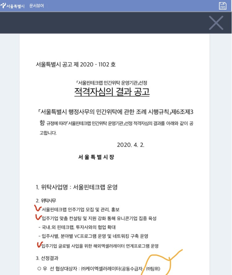 정부 사업의 수주를 단순히 인건비의 활용과 기업의 존속에만 의미를 둔다면 정부 사업에 대한 자부심을 가지기 어렵다. 이번에 서울시 핀테크랩 민간 위탁 사업을 준비하면서 깨달은 것은 크게 2가지이다. 정부의 민간 위탁 사업은 이윤 추구와는 거리가 멀다는 것과 정부의 민간 위수탁 경험(경력)은 신뢰도면에서 인정을 받는다는 점이다.