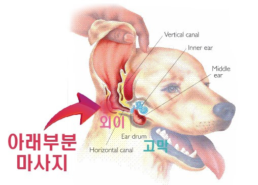 왼쪽은 사람의 귀로 외부와 내부가 1자로 되어 있는 반면 강아지는 ㄴ자로 되어 있다. 꺾여 있기 때문에 습하거나 피지가 많아지면 문제가 생기게 된다.