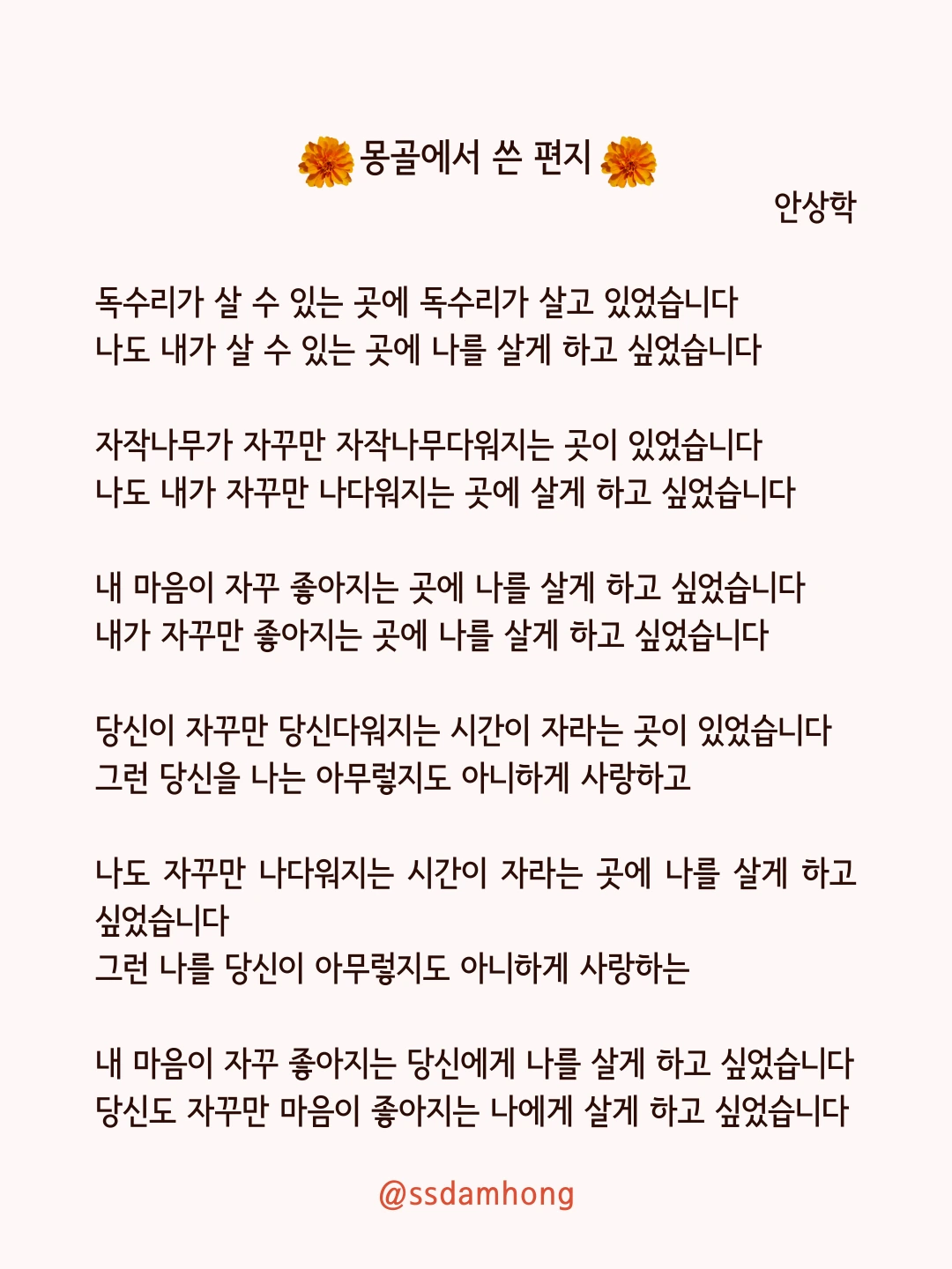 '나도 자꾸만 나다워지는 시간이 자라는 곳에 나를 살게 하고 싶었습니다'라는 시의 구절을 읽는데 가슴이 찌르듯 아팠어요.