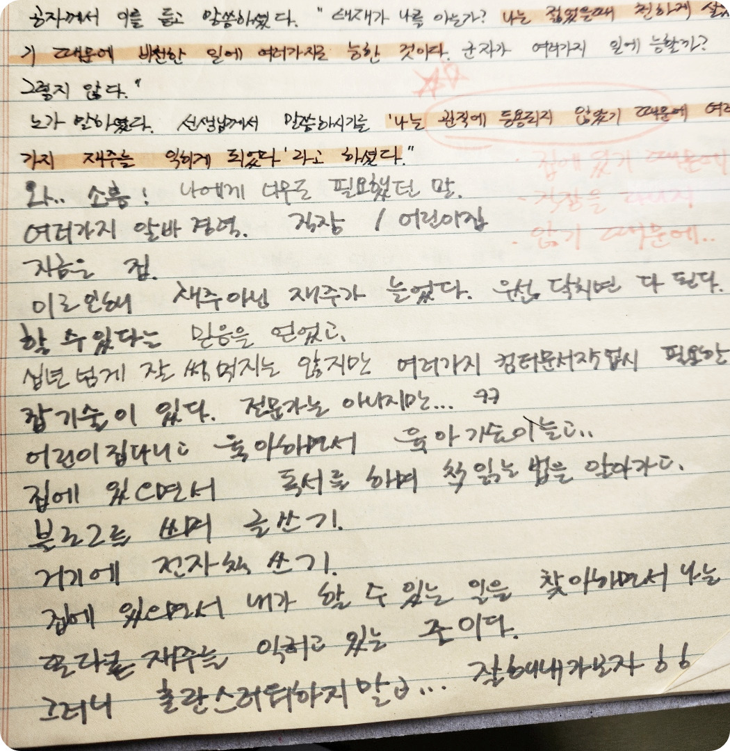 [와... 소름! 나에게 너무나 필요했던 말이다. 여러 가지 알바 경력, 직장 생활 그리고 지금 전업주부 생활로 인해 재주 아닌 재주가 늘고 있다는 생각을 하게 되었다. 우선 ‘다치면 다 된다!’라는 할 수 있다는 믿음을 얻었고, 컴퓨터 문서 작업 시 필요한 기술을 가지고 있다. 그리고 어린이집에서 보육교사 생활을 하고, 아이들을 키우면서 육아 기술이 늘어났고, 집에서 책을 읽으면서 독서법을 익히고, 글을 쓰기 시작해서 전자책을 썼다. 집에 있으면서 내가 할 수 있는 일을 하면서 나는 또 다른 재주를 익히는 중이이다. 그러니 혼란스러워하지 말고, 잘해보자!