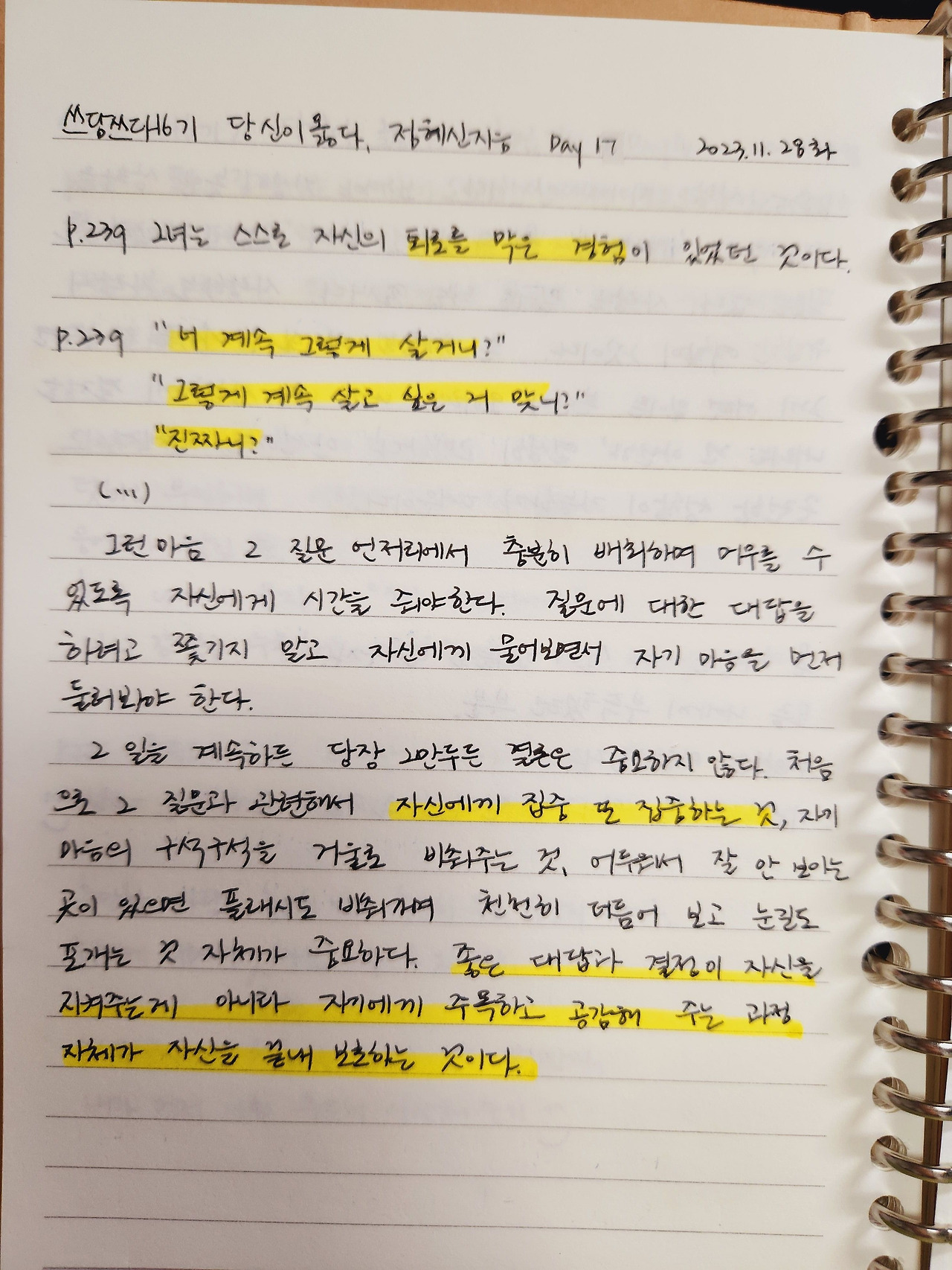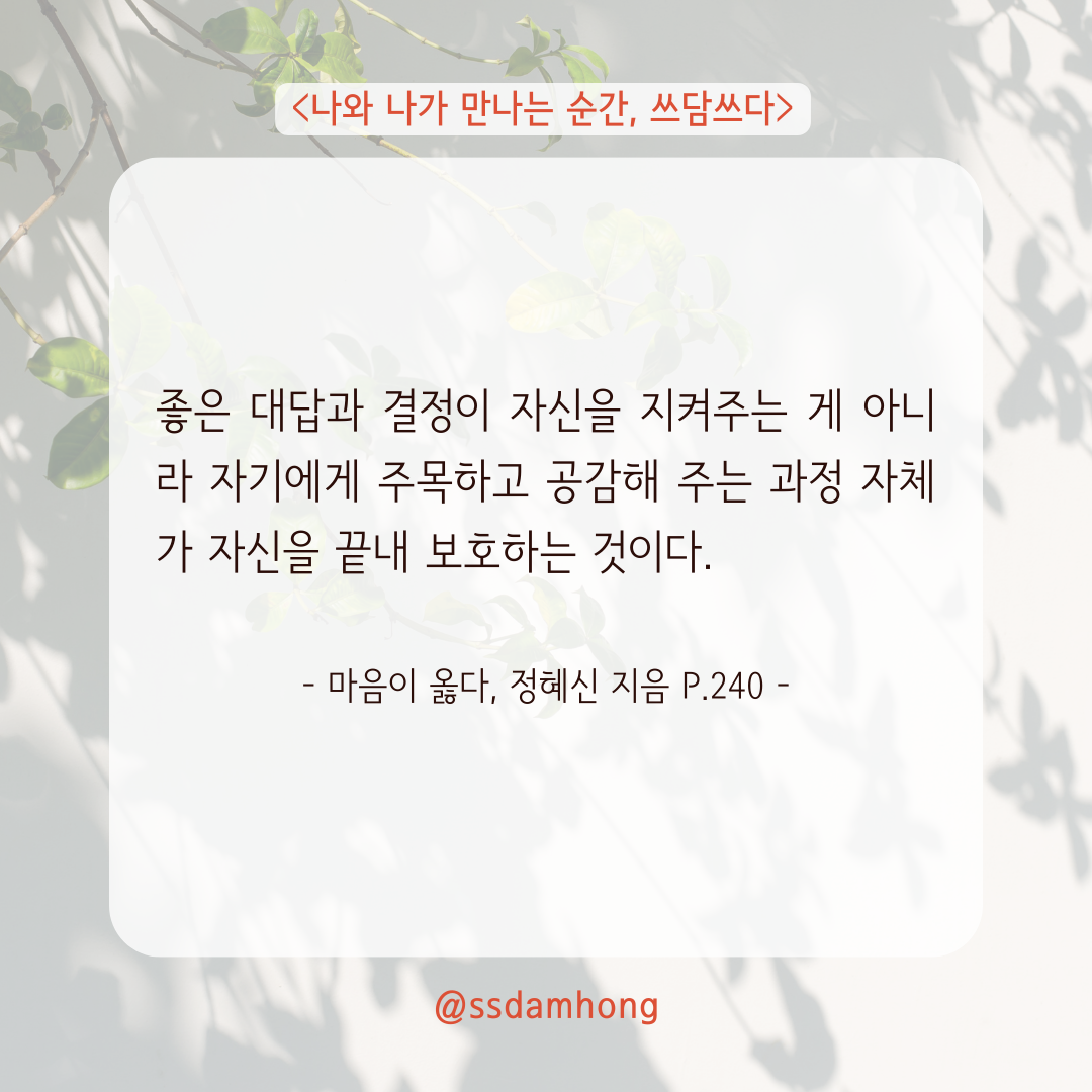 좋은 대답과 결정이 자신을 지켜주는 게 아니라 자기에게 주목하고 공감해 주는 과정 자체가 자신을 끝내 보호하는 것이다.
