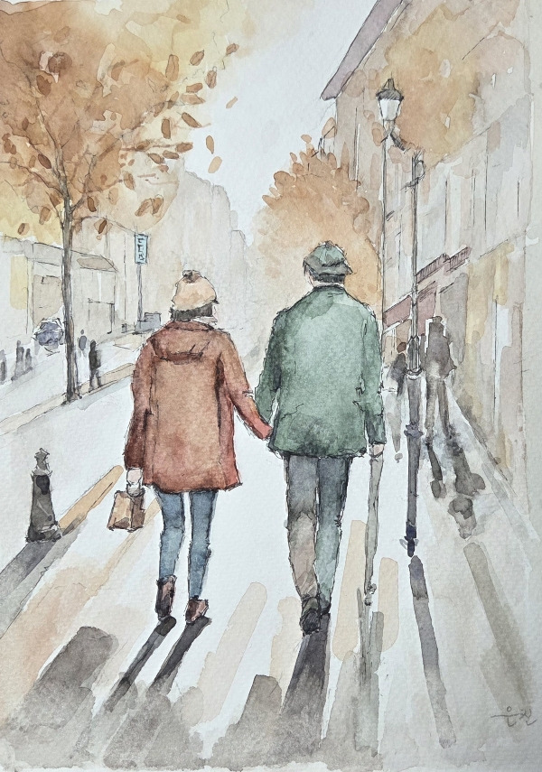 다시 그림 속에서 나는 거리를 둔다. 두 사람이 걷는 거리에는 가을빛이 가득하다. 그들이 젊은 연인인지, 노부부인지, 막 손을 잡은 사이인지는 알 수 없다. 나는 그저 뒷모습을 보며 상상한다. 그들이 나를 바라보지 않아 좋다. 부르지도, 따라가지도 않는다. 한 발짝 뒤에서 두 사람의 움직임을 종이에 옮길 뿐이다.