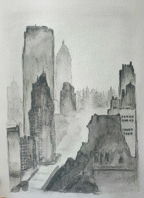 나는 곧 수성연필을 들었다. 처음엔 낯설었지만, 손끝에서 점차 빌딩들의 명암이 살아났다. 가까운 곳은 짙고 묵직하게, 먼 곳은 가볍게 스치듯 스케치했다. 마침내 연필과 물이 만나자, 진회색 선들이 마법처럼 녹아 퍼져나갔다. 어둠 속으로 스며든 도시는 차가운 얼굴을 지우고, 묵직한 생명체로 다시 태어난 듯했다. 그런 도시에 한 번쯤 살아보고 싶다는 엉뚱한 생각이 스쳤다.