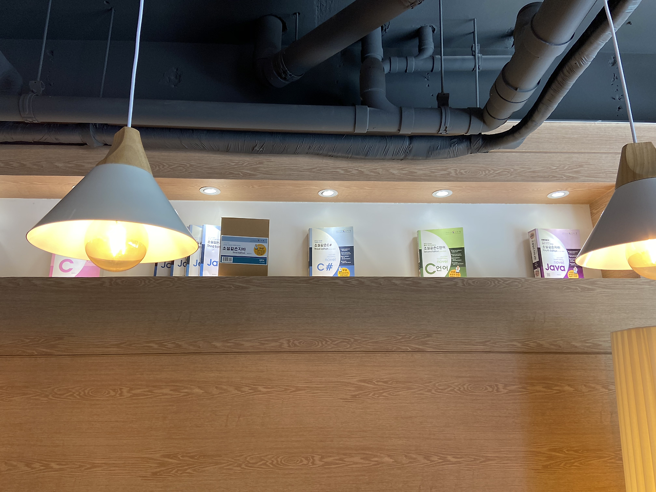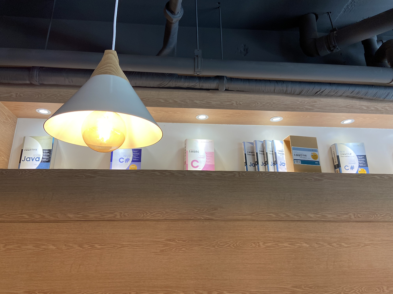 와우..! C언어, 자바 같은 컴퓨터 책들을 쭉 디피해놓은 카페는 처음 봤다.