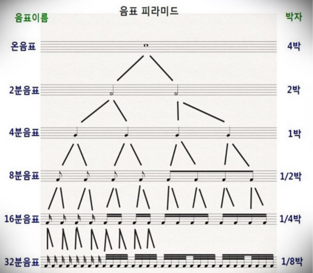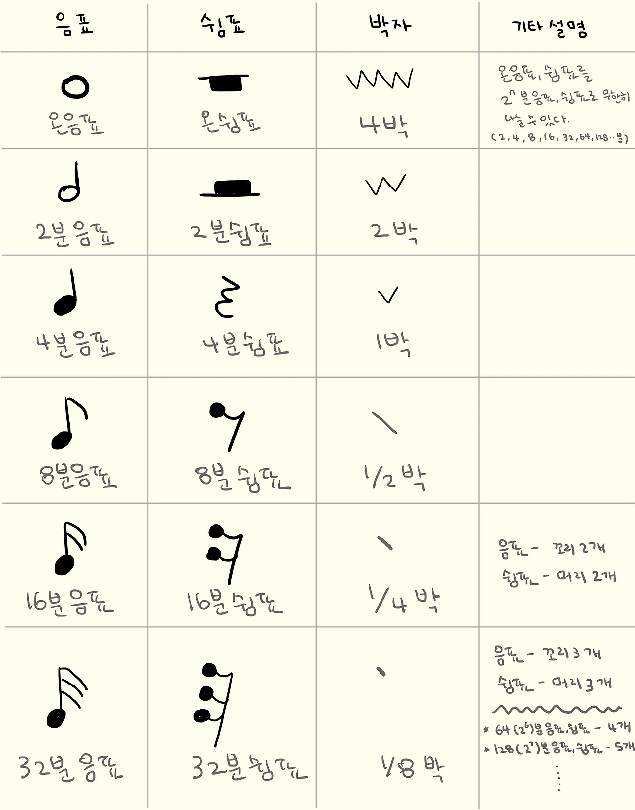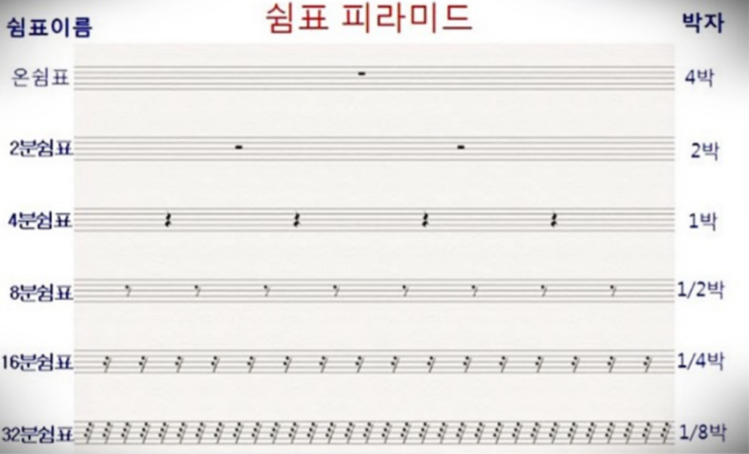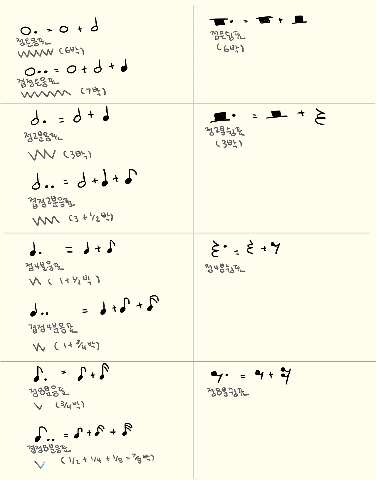 음표 또는 쉼표에 점이 붙으면 바로 앞의 절반 박자를 더해주는 개념이다.