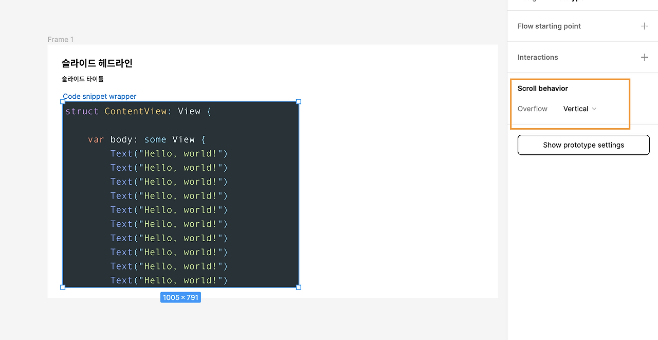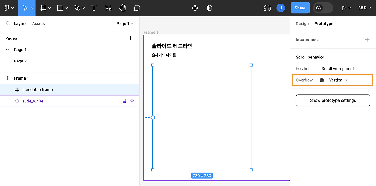 prototype > overflow 에 가서 vertical 을 선택해줍니다. (overflow 되는 콘텐츠가 있으면 verticl scroll을 하겠다~)