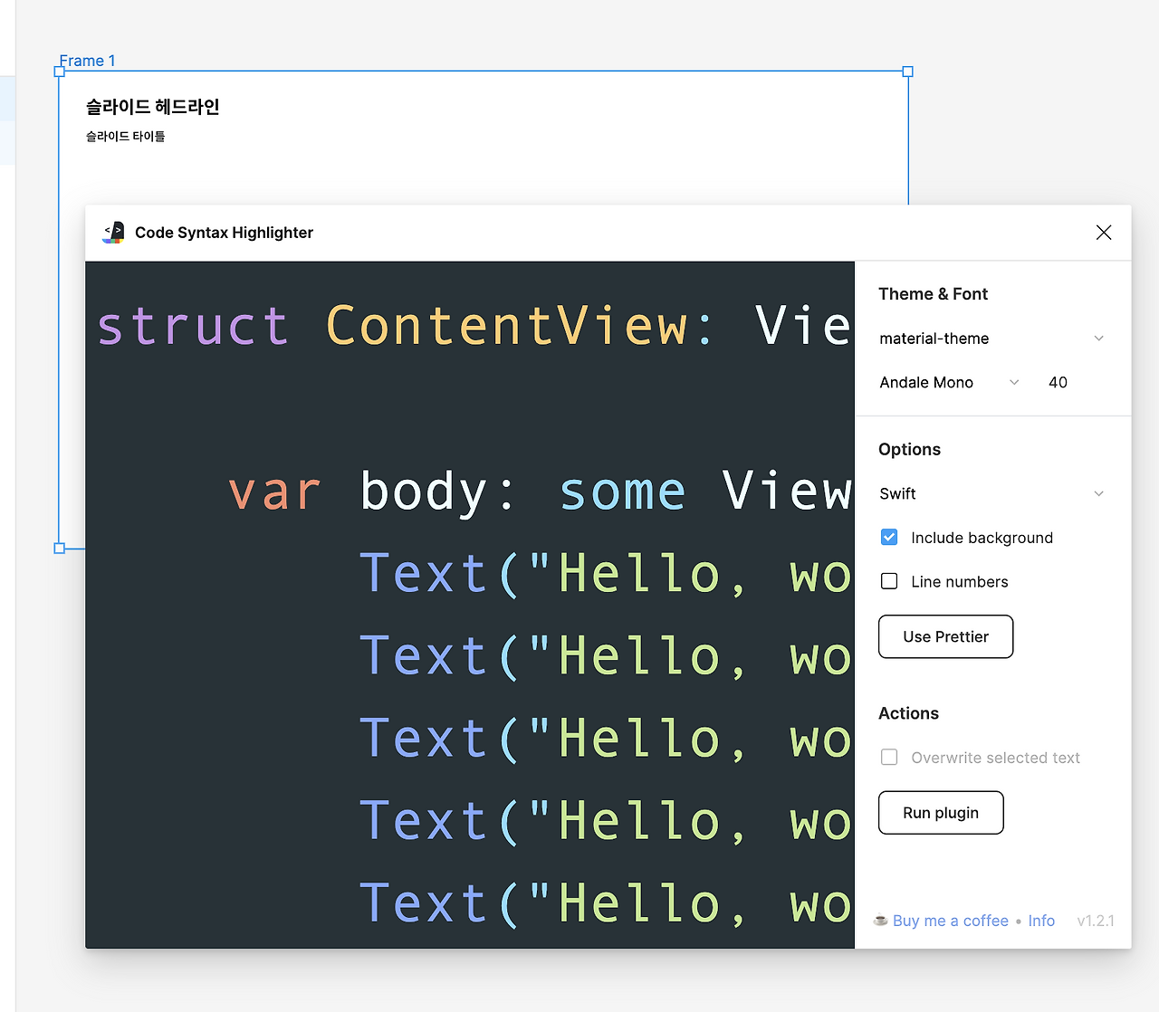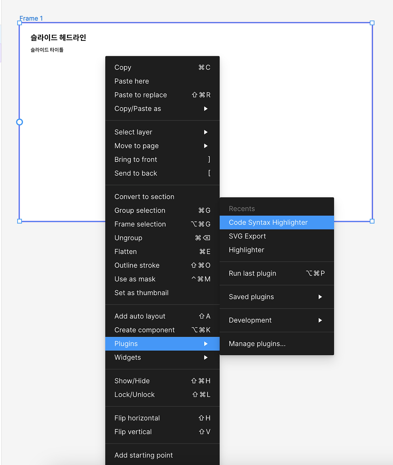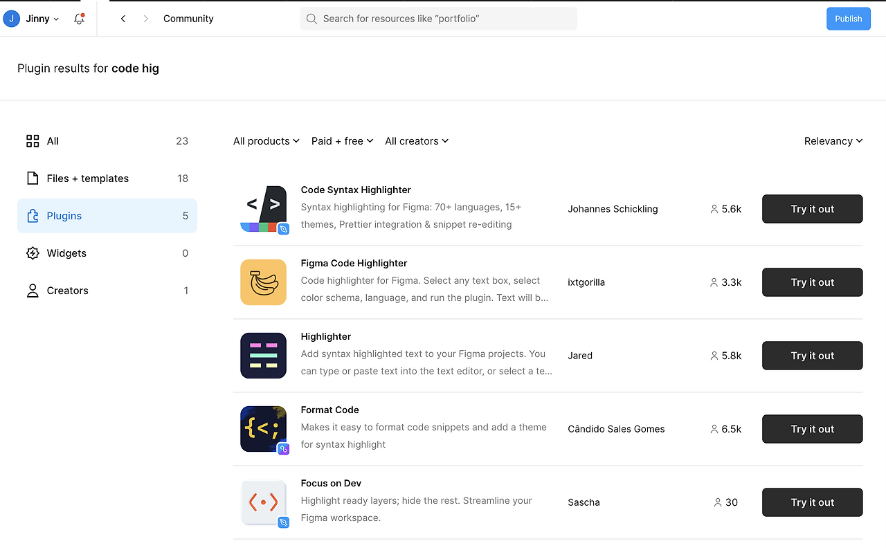 피그마 커뮤니티에서 여러개의 code highlighter 플러그인을 다운받을 수 있어요~