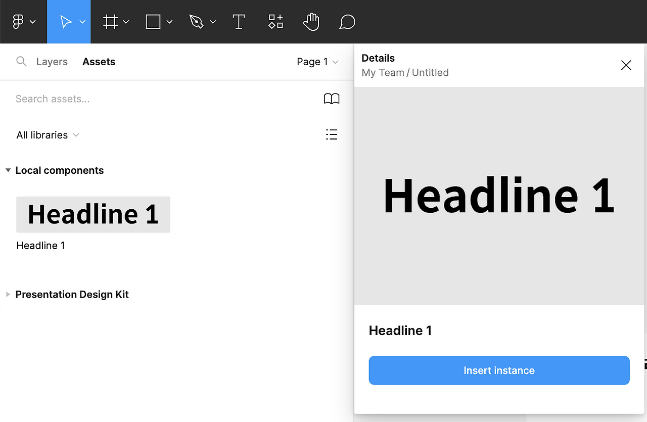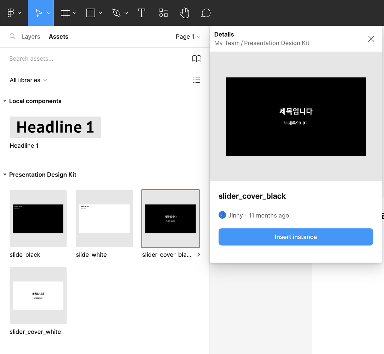 이제 Assets 에 컴포넌트가 뜨고 이걸 클릭하면 insert instance 가 나옴!
