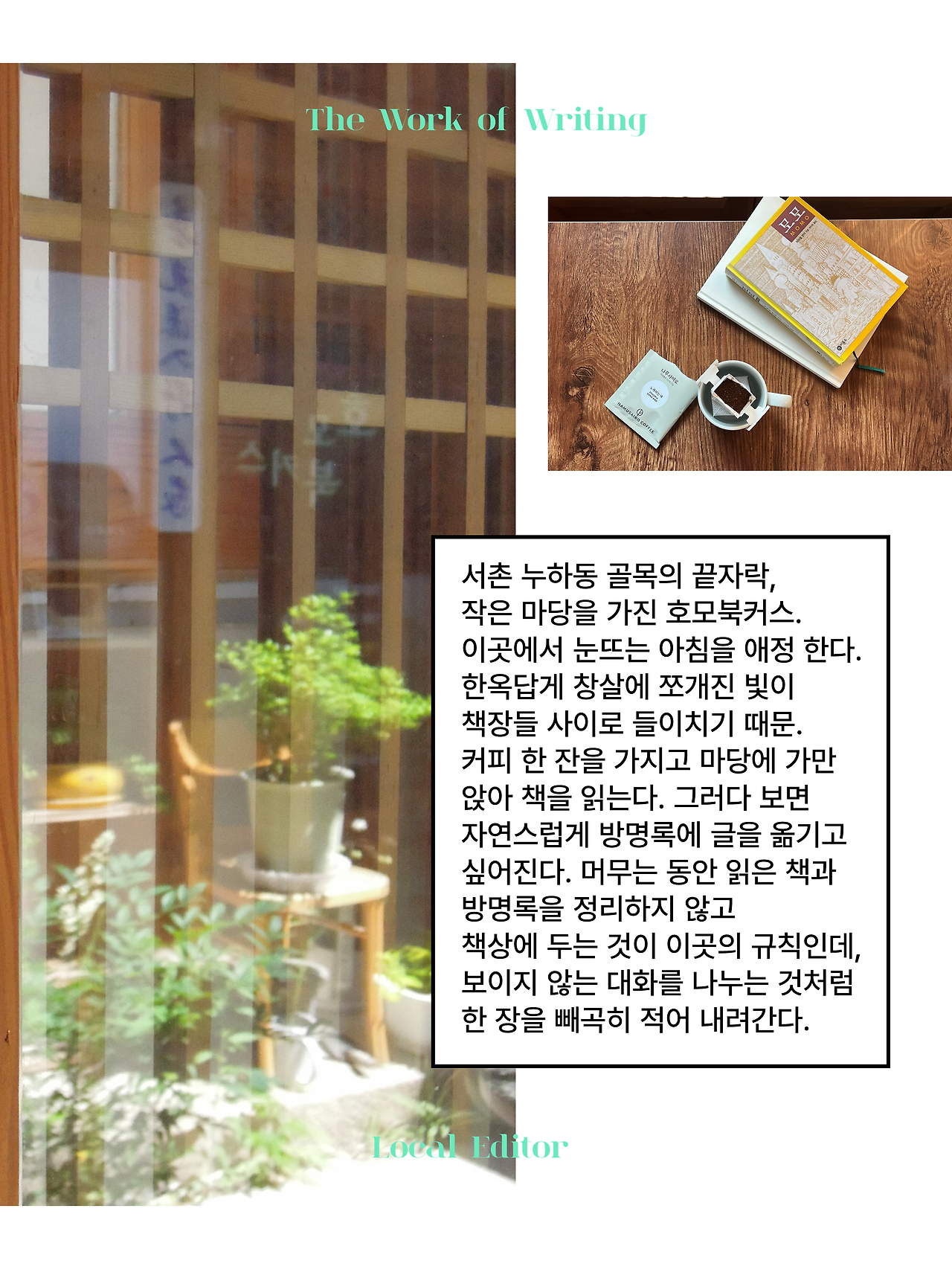 서촌 누하동 골목의 끝자락, 작은 마당을 가진 호모북커스. 이곳에서 눈뜨는 아침을 애정한다. 한옥답게 창살에 쪼개진 빛이 책장들 사이로 들이치기 때문. 커피 한 잔을 가지고 마당에 가만 앉아 책을 읽는다. 그러다 보면 자연스럽게 방명록에 글을 옮기고 싶어 진다. 머무는 동안 읽은 책과 방명록을 정리하지 않고 책상에 놓아두는 것이 공유서재의 규칙인데, 보이지 않는 대화를 나누는 것처럼 한 장을 빼곡히 적어 내려간다.