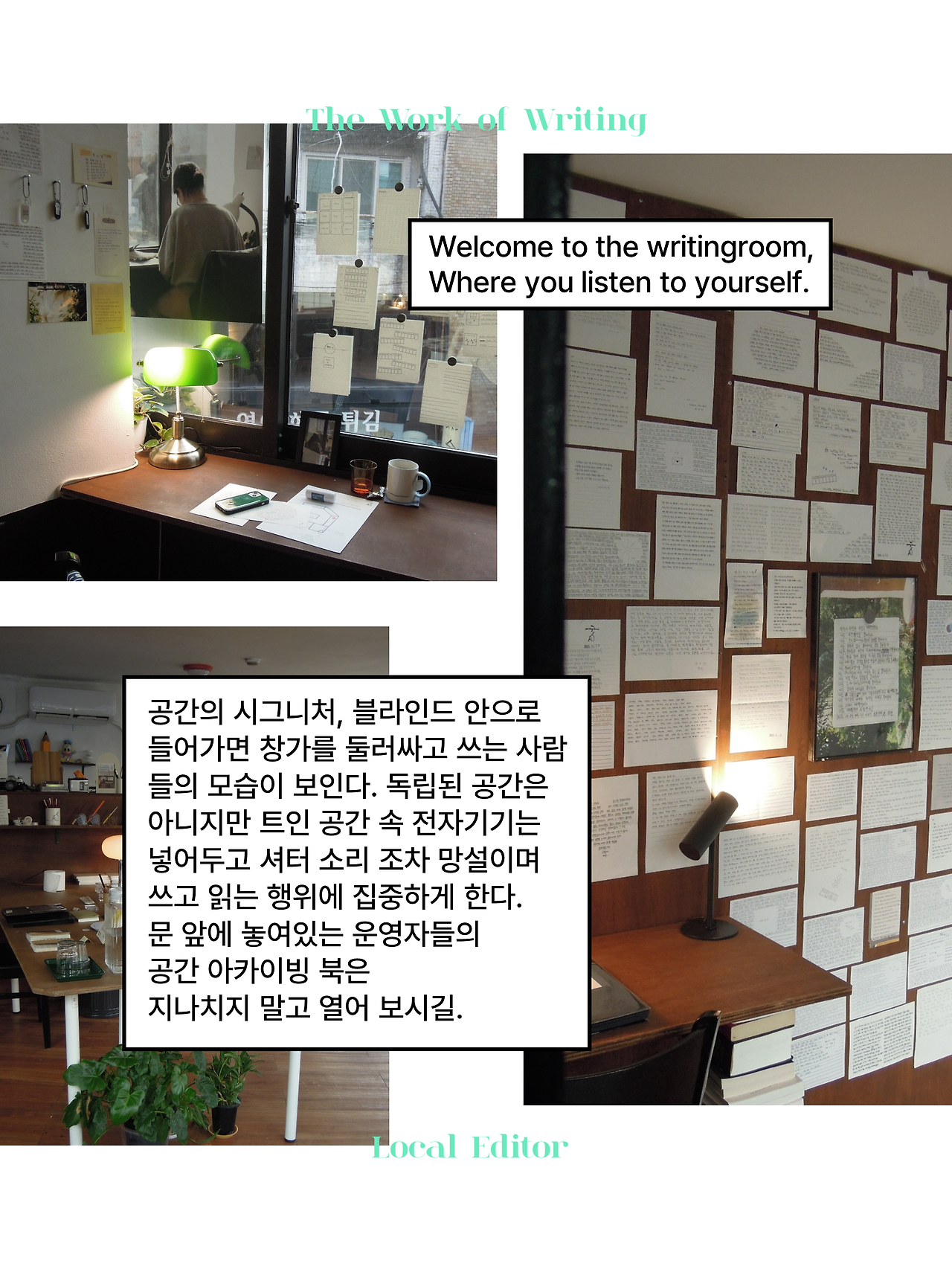 공간의 시그니처 블라인드 안으로 들어가면 창가를 둘러싸고 쓰는 사람들의 모습이 보인다. 독립된 공간은 아니지만 트인 공간 속 전자기기는 넣어두고 셔터 소리조차 망설이며 쓰고 읽는 행위에 집중하게 한다. 문 앞에 놓여있는 운영자들의 공간 아카이빙 북은 지나치지 말고 열어보시길.