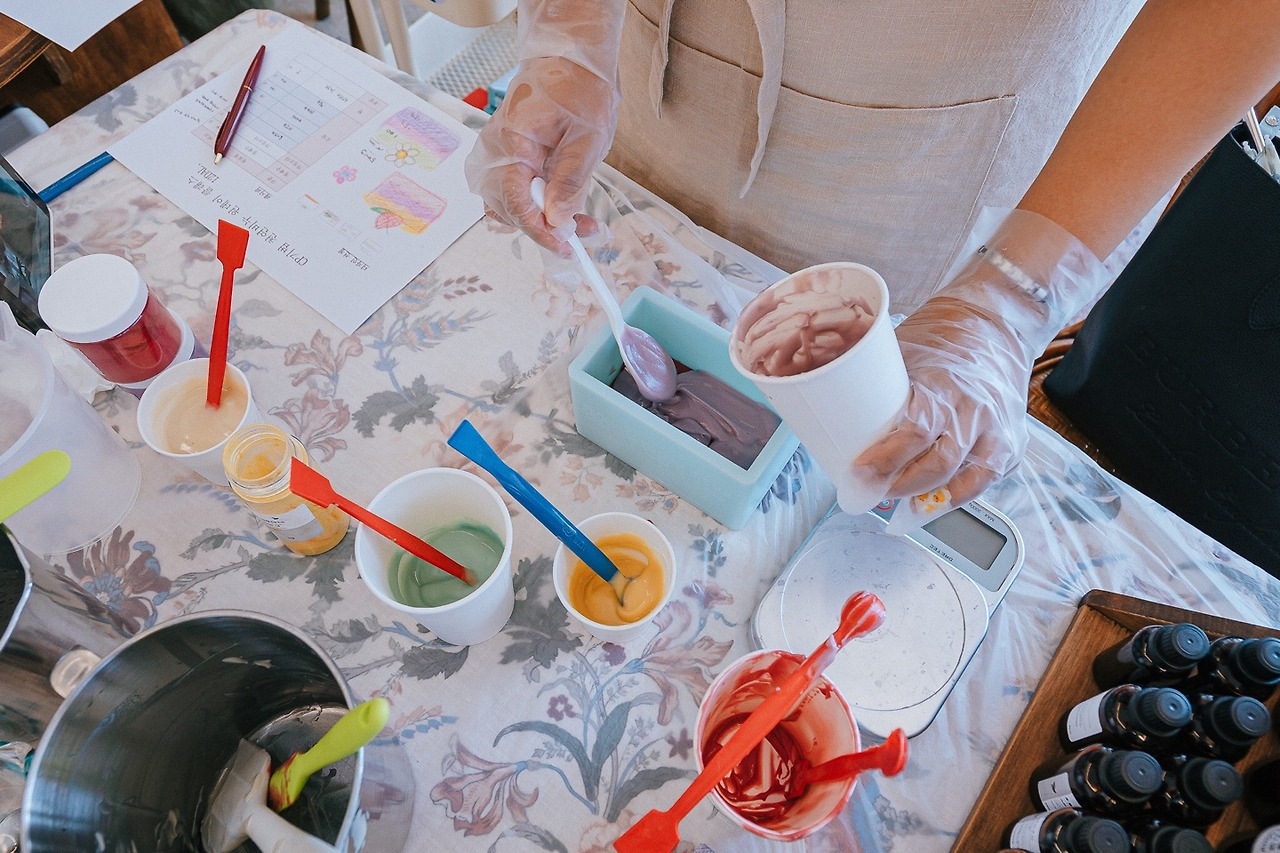 그렇게 잘 섞인 비누 반죽에 디자인 비율에 맞는 분말을 섞어 색색의 반죽을 위한 반죽을 한다. (또 몰입의 단계가 시작되지만, 이것은 그리 길지 않다.) 반죽을 위한 반죽을 다 만든 뒤에는 틀과 그림에 맞춰 색을 차곡차곡 쌓고 마지막으로 다른 사람의 것과 헷갈리지 않도록 내 이름을 적으면 클래스는 끝이 난다.