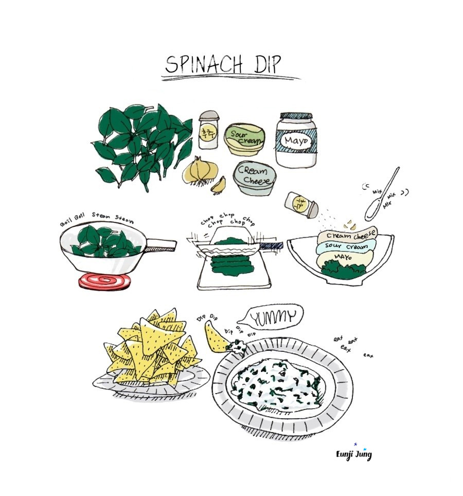 학생이었기 때문에 항상 돈이 없었다. 학교 과제 때문에 아르바이트는 거의 불가능했다. 그래서 있는 돈에서 최대한 아끼며 살아갈 수밖에 없었다. 생활비와 용돈을 아끼기 위해선 집에서 음식을 만들어 먹는 게 필수인데 집에서 먹는 삼시 세끼뿐만 아니라 간식, 도시락, 심지어 술안주까지 다 만들어 먹었다. 바에 가서 맛있는 안주 시켜놓고 맥주를 마시며 친구들과 편하게 놀고 싶지만 한 푼이라도 더 아끼고 싶은 마음에 '집에서도 맛있는 거 먹으며 즐길 수 없을까' 늘 고민을 했었다. 여러 술안주를 시도했는데 그중 만들기도 쉽고 저예산으로 친구들과 맛있게 먹을 수 있는 음식을 발견했다. 스피니치 딥 :)