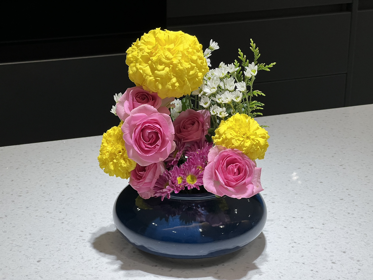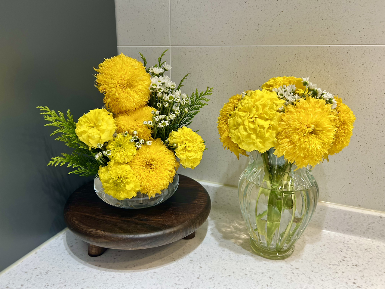 꽃꽂이 작품을 만드는 일도 글을 쓰는 일과 같았다. 꽃꽂이를 시작하고 나에 대해 알게 된 점 중 하나는, 내가 생각보다 명도와 채도가 높은 쨍한 색감을 좋아한다는 것이었다. 나는 빈티지한 파스텔 계열의 색을 좋아한다고 생각했었는데, 꽃을 고르다 보면 나도 모르게 밝고 강렬한 색의 꽃에 손이 갔다. 노란색 역시 너무 존재감이 센 것 같아 꺼려하는 색이었지만, 노란 메리골드와 테디베어 해바라기, 노란 장미들을 꽂아보며 그 발랄한 매력에 흠뻑 빠졌다. 그리고 생각보다 리듬감이 없는 형태를 규칙에 따라 꽂는 것에도 편안함을 느꼈다. 요즘 소셜미디어에서 많이 보이는, 하트 모양처럼 양 옆이 높은 프렌치 스타일 작품도 예뻤지만 동그란 반구형 모양으로 꽃을 꽂는 방법도 마음에 들었다. 균형감이 있는 안정적인 느낌도 좋았고, 동글동글한 모습이 그저 귀여웠다. 예전에는 이런 대칭을 이루는 방식이 촌스럽게 느껴져서 기피했는데, 막상 꽂아보니 마음에 들었다. 다른 사람의 작품을 눈으로 구경만 할 때는 잘 몰랐는데, 직접 표현해보니 나의 취향을 제대로 찾을 수 있었다. 내 손으로 만든 이 작품은 플로리스트라는 꿈을 이루는 과정 속에서 나온 결과물이기도 했지만, 동시에 내가 누구인지를 보여주고 있었다. 이 작품이 곧 나인 것 같았다. 내가 좋아하는 것들을 오롯이 담고 있기 때문이다. 완벽하진 않지만 가장 나와 닮았기에 세상에서 제일 마음 가는 내 작품.