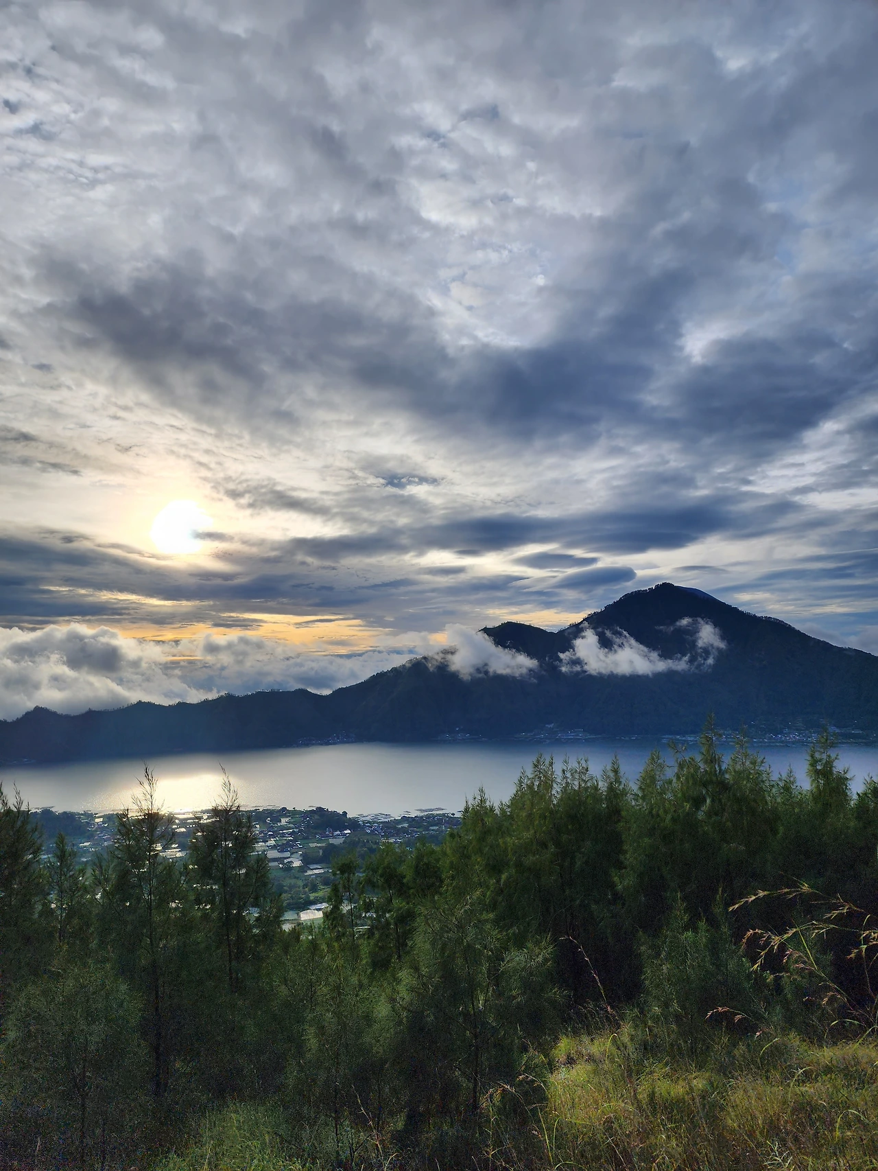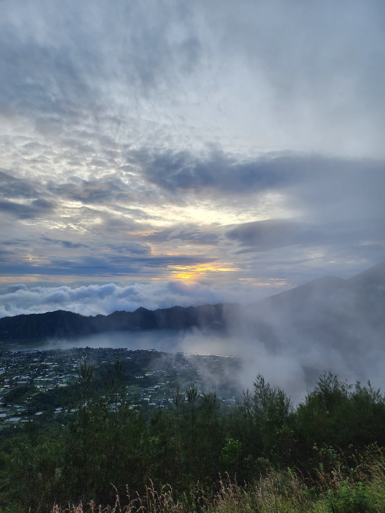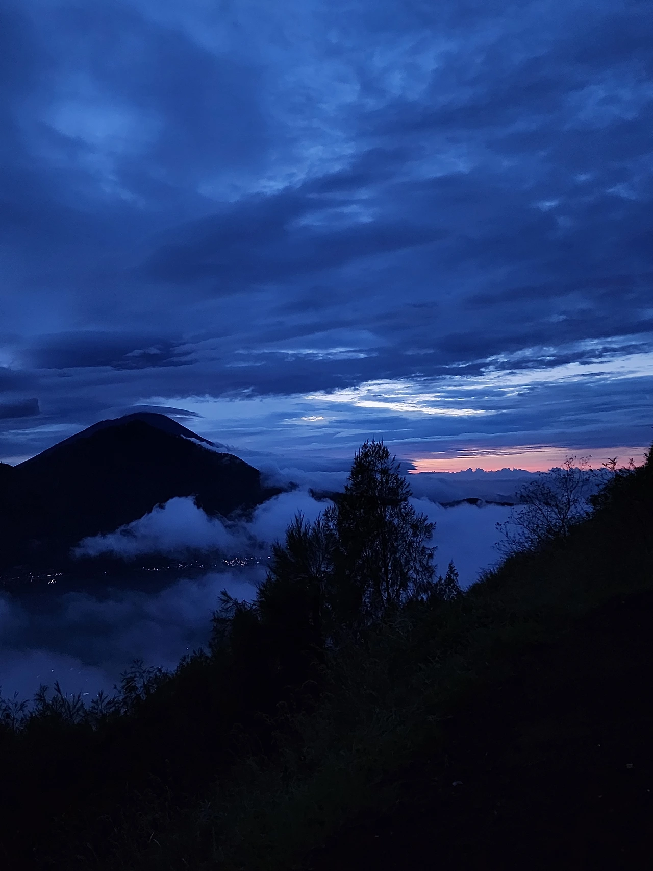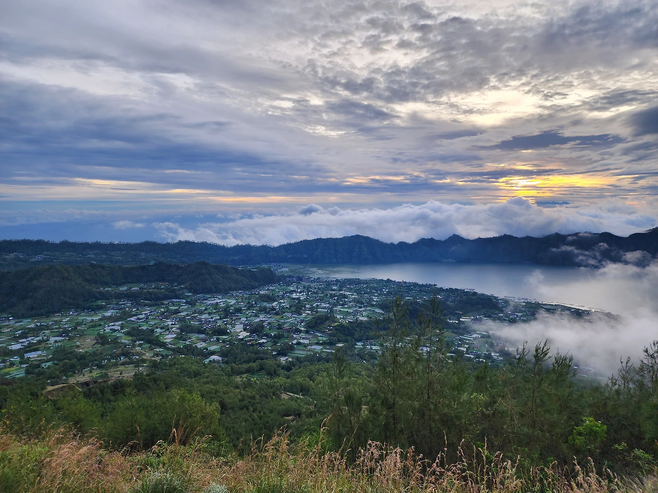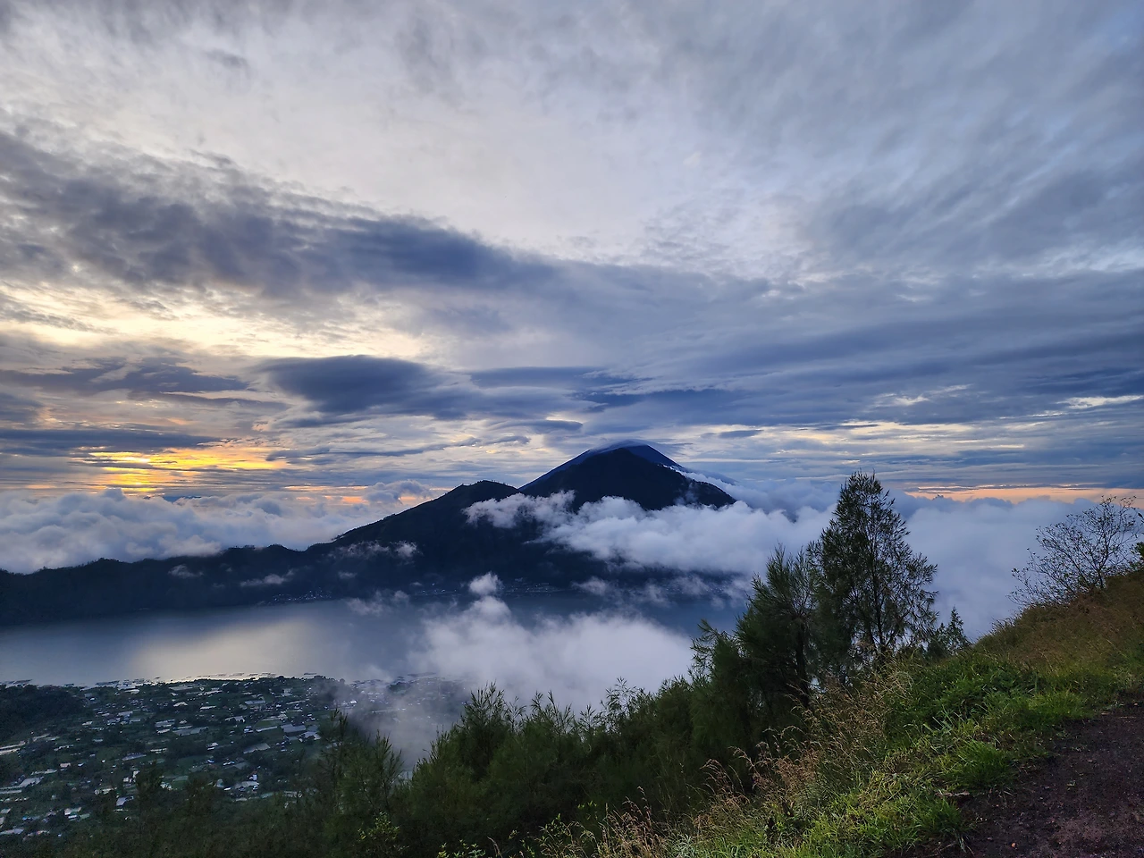 생각보다 구름이 많이 껴서 일출을 제대로 보지 못할까 봐 걱정이 되었는데, 날이 밝아오고 구름이 살짝씩 걷히면서 바투르 호수도 보이고 저 멀리 아궁산도 보이면서 멋진 일출에 대한 희망이 보였다. 한국에서나 발리에서나 역시 등산은 계속 10분 뒤면 도착한다는 거짓말 덕분에 정상에 간다. 3번 정도 10분 뒤에 도착한다는 말 끝에 드디어 도착했다. 정상은 1717M. 정상에 오르니 아직도 활화산이라는 아궁산이 보였다.