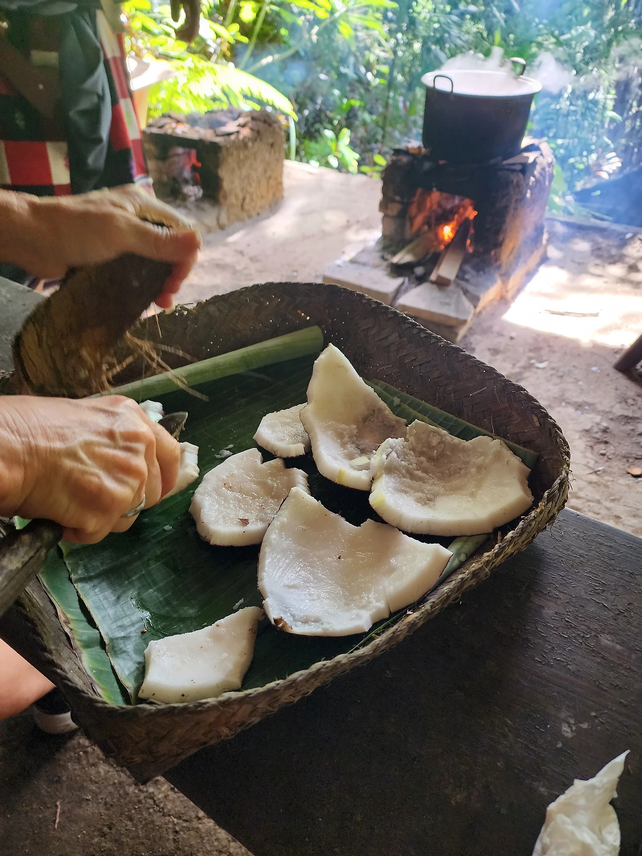 엄청나게 크고 무서운 칼로 코코넛을 턱턱 쳐서 껍질을 벗기고 갈랐더니, 코코넛 에그가 탁! 먹어보니 사각사각한데 솜사탕 같은 식감과 맛이었다. 코코넛 과육을 발라내어 강판에 갈고, 끓인 코코넛 워터를 부어 조물조물했더니 코코넛 밀크가 딱! 신선한 코코넛 밀크는 부드러움과 향긋함을 동시에 가지고 있었다. 바나나잎으로 만든 그릇에 담아 마시는 따끈한 코코넛 밀크의 맛이란! 평생 처음 먹어보는 맛에 저절로 물개박수가 튀어나왔다.