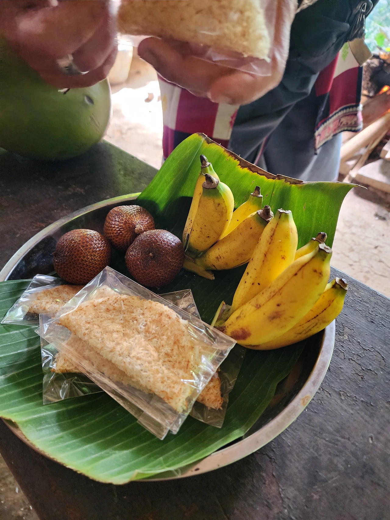 적고 보니 간단하지만, 결코 간단하지 않았던 과정들이 즐거웠던 이유는 매 순간 사려 깊게 보살펴주고 함께 웃어주는 붐붐과 그의 가족들 덕분이었다. 중간중간 대기 시간에는 배가 터질 정도로 간식을 주었는데, 특히 잘게 간 코코넛을 얇게 부친 과자에다가 바나나를 싸서 먹는 ‘코코넛 바나나 타코’가 정말 별미였다. 부담스럽지 않은 단맛이 몸에 스며드는 맛!