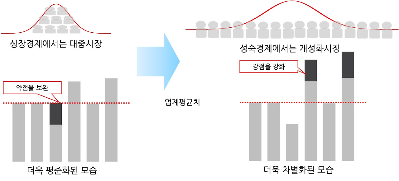 '경쟁자에게서 배운다’는 말은 ‘경쟁자의 방식을 따라 한다’ ‘경쟁자에 비해 약한 것을 보완한다'와 같은 의미입니다. ‘중심 경향성’을 보이는 이유는 모두가 동일한 방식으로 경쟁을 바라보기 때문입니다. 동일한 방식으로 산업을 정의하고, 시장을 세분화하고, 벤치마킹을 하다 보니 전략이 비슷해질 수밖에 없는 것입니다.