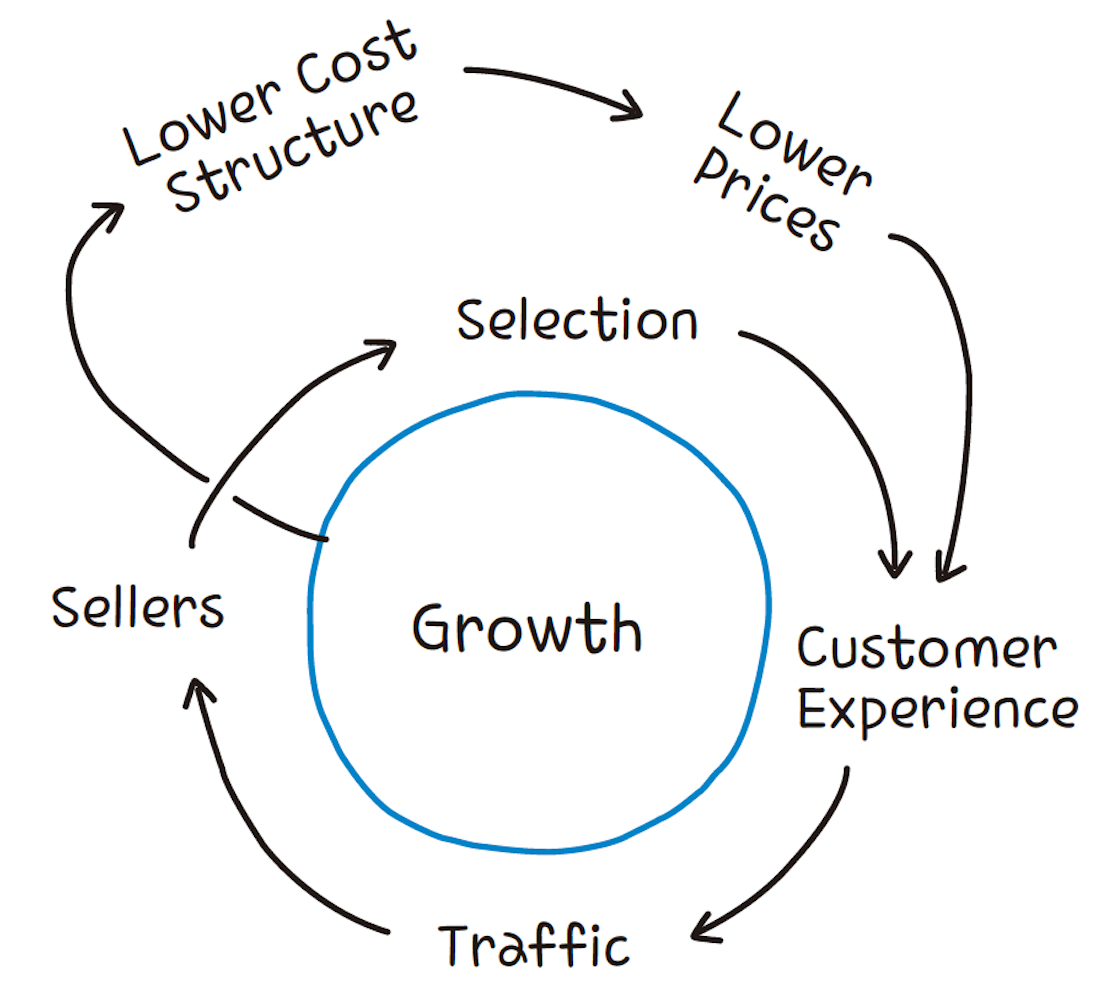 그림은 아마존의 창업자 제프베조스가 그린 플라이휠 비즈니스모델입니다. 플랫폼에서 판매하려는 사람들이 많아지면 많아질수록 플랫폼의 시장 지위와 경쟁력은 커지게 됩니다. 구매자들은 다양한 상품과 경쟁으로 인해 낮은 가격에 제품을 구매할 수 있게 되고, 이것은 다시 더 많은 판매자를 유입시키는 역할을 합니다. 판매자들은 구매자들에게 선택받기 위해 가격경쟁을 하게 되고, 시간이 흐르면 플랫폼은 최저가라는 인식이 자리 잡게 됩니다. 어느 순간부터 무엇인가를 구매할 때 여기저기를 떠도는 것이 아니라 쿠팡을 이용하는 것과 같이 독점적인 플랫폼이 탄생하게 되는 것입니다.