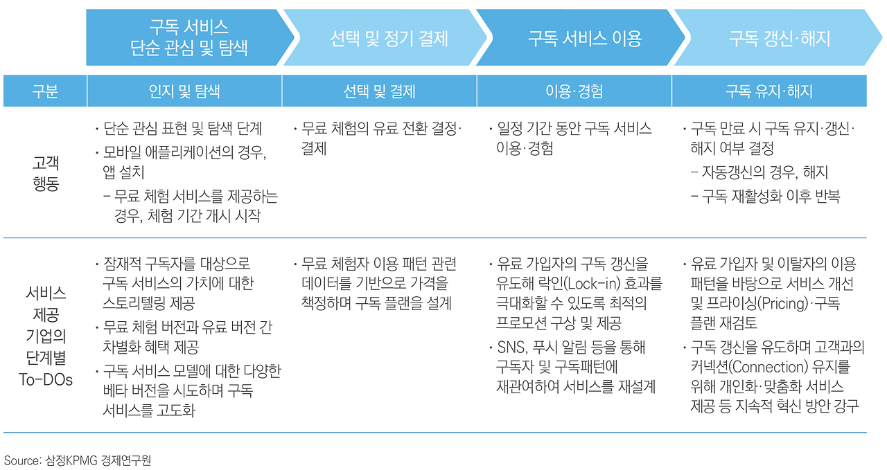 비즈니스는 1회성 거래에서 장기간 관계로 변화되고 있는 중입니다. 이에 따라 구독 경제는 산업 전반과 소비자 일상에서 더욱 많이 도입될 것입니다. 이를 도입하고자 하는 기업들은 중장기적 관점에서 일관된 목표와 방향을 수립하고 단계적인 사업체계 전환이 필요합니다.