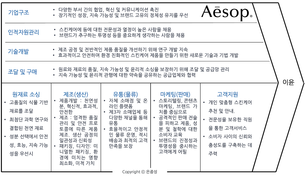 이솝은 1987년 호주 멜버른에서 설립된 스킨케어 브랜드입니다. 식물 기반 원료로 만든 고가의 크림과 로션 등으로 유명한 기업으로 2023년에 세계적인 화장품 기업 로레알이 인수를 하였습니다. 이솝의 성공요인으로 고품질의 제품, 독특하고 일관된 브랜딩, 몰입감 있는 소매 경험, 스토리텔링, 콘텐츠 마케팅 등을 들 수 있습니다.