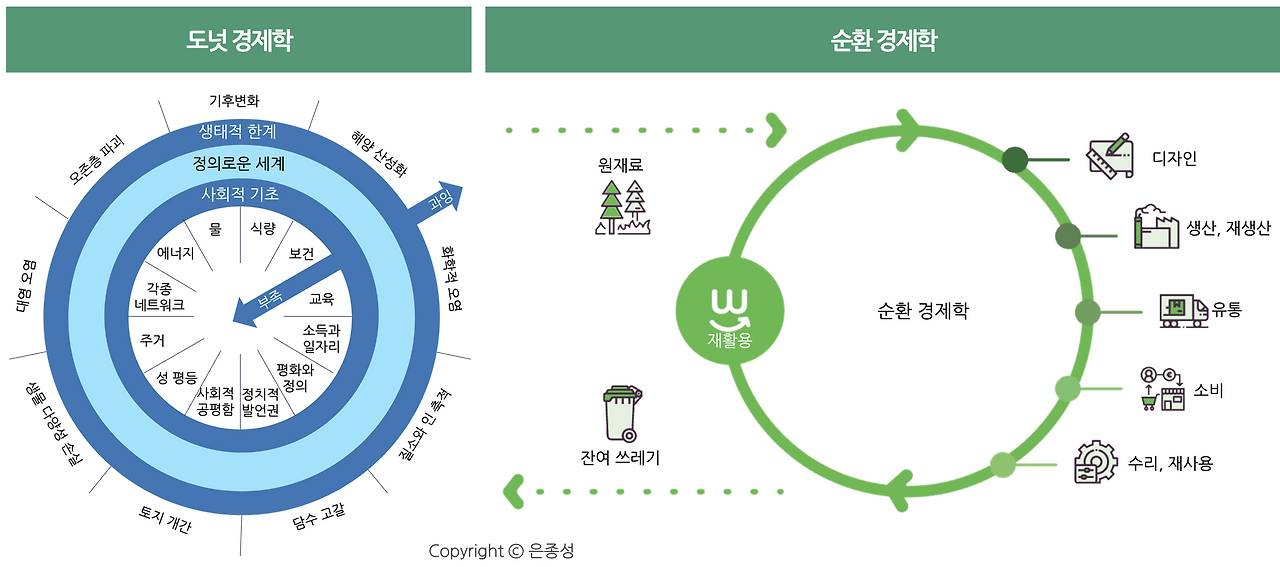 인류가 '주주 자본주의'에서 '이해관계자 자본주의'와 'ESG'로 전환해야 하는 이유를 설명하는 이론으로 도넛경제학과 순환경제학을 들 수 있습니다. 도넛경제학(Doughnut economics)은 영국의 경제학자 케이트 레이워스(Kate Raworth)가 창안한 경제학 이론으로 도넛 모양을 중심으로 새로운 시스템이 균형적으로 성장하기 위한 조건을 설명하고 있습니다.