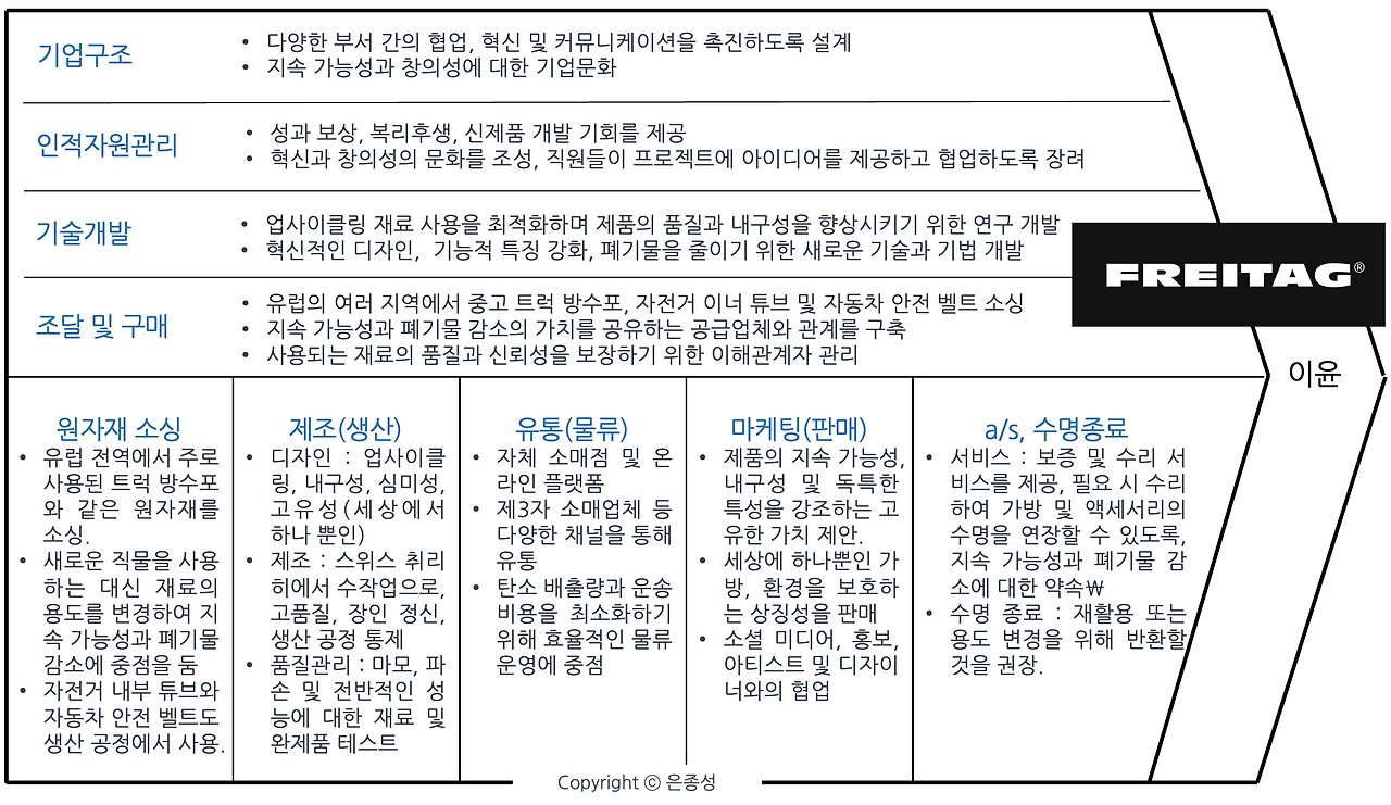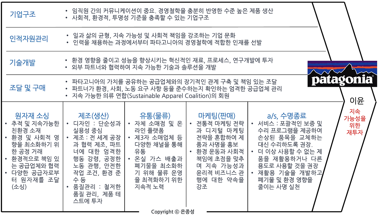 아래 그림에서 보는 것과 같이 파타고니아의 놀라운 점은 기업이 추구하는 가치에 맞게 가치사슬을 통합했다는 것입니다. 일반적으로 기업은 원자재 소싱 → 제조(생산) → 유통(물류) → 마케팅(판매), 사후관리로 이어지는 본원적 활동이 중요합니다. 기업구조, 인적자원관리, 기술개발, 조달 및 구매는 본원적 활동을 지원하는 형태를 취하는 것이 일반적입니다.