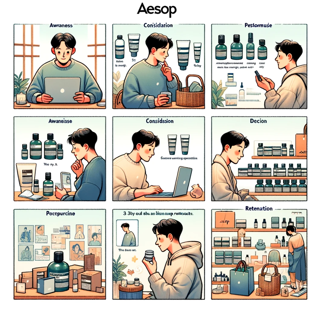 이솝 화장품을 구매한 후(Post-Purchase)에는 제품의 효과와 자신의 가치관 및 스킨케어 목표에 부합하는지를 평가할 것입니다. 제품에 만족했다면 충성도가 높은 고객이 되어 이솝을 재구매하고 친구에게 추천하거나, 소셜 미디어나 지인들에게 자신의 경험을 공유할 것입니다.