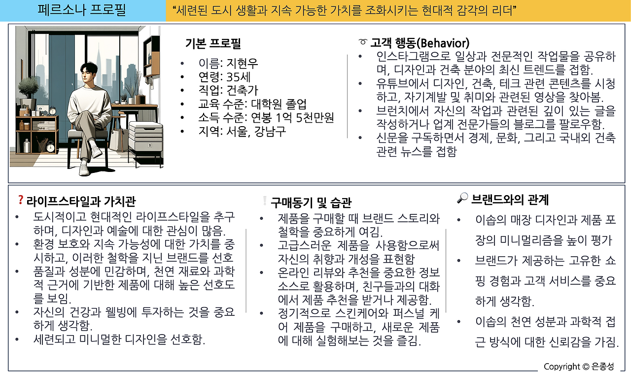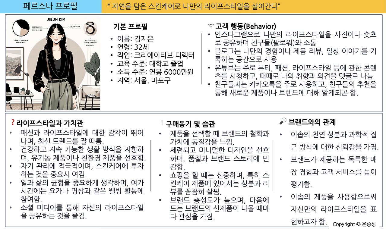 시장세분화 변수를 기준으로 이솝이 타겟팅하는 고객은 단순히 스킨케어 제품을 찾는 것이 아니라 고급 스킨케어를 원하는 사람들로 타깃으로 하고 있습니다. 이를 조금 더 구체화하면 1) 제품의 품질, 성분, 브랜드 평판 등 품질에 민감한 사람, 2) 지속 가능성과 윤리적 소싱 등 환경 및 윤리에 민감한 사람, 3) 독특한 디자인과 패키징 등 독특한 소매경험을 중시하는 사람으로 군집화 해볼 수 있습니다.