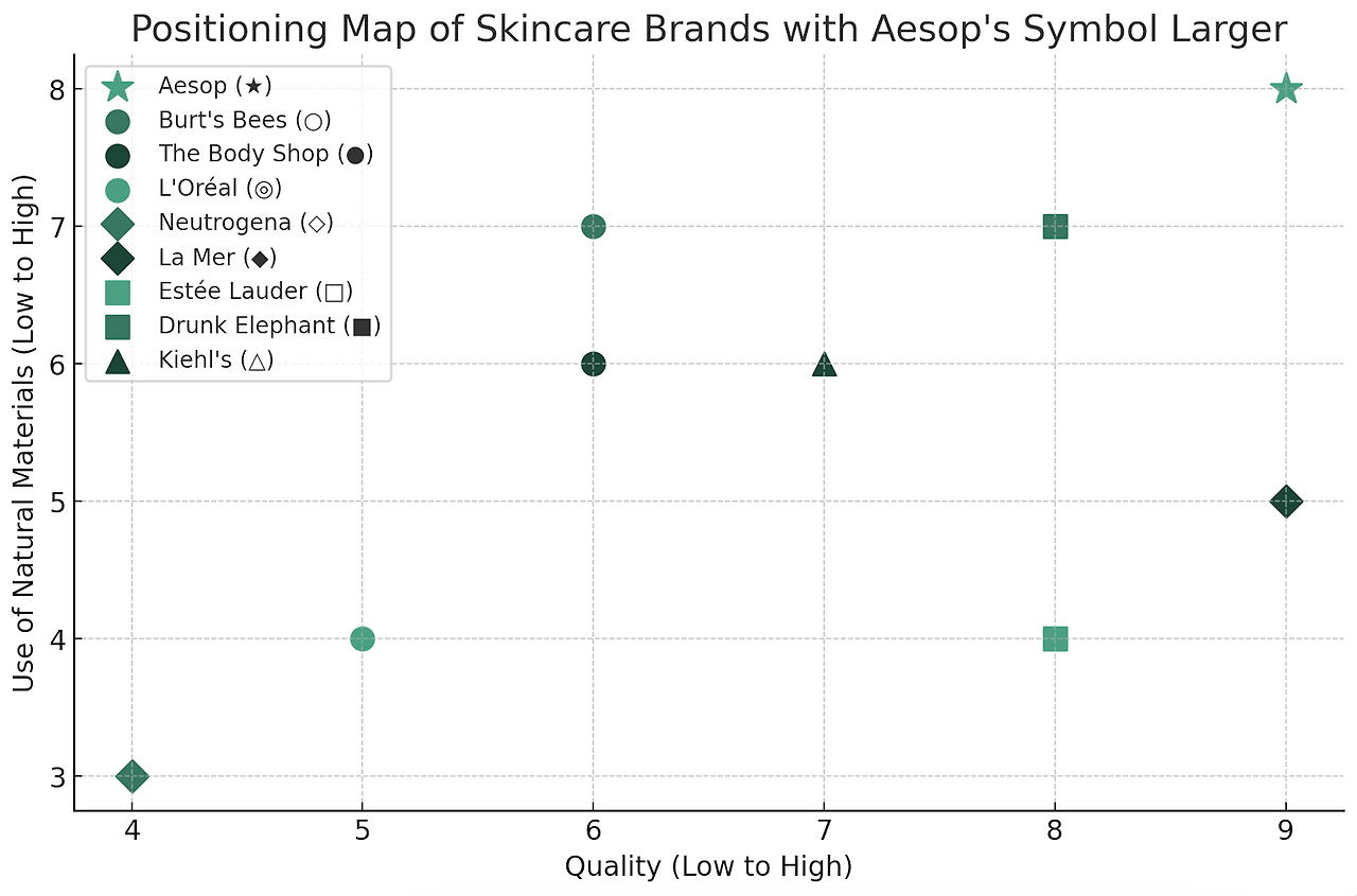 목표로 하는 시장과 페르소나가 구체화되었다면 이를 바탕으로 기업이 인식되고자 하는 포지셔닝 맵을 작성 해야 합니다. 포지셔닝 맵에서 중요한 것은 X축과 Y축을 어떻게 설정하느냐입니다. 이솝의 포지셔닝 맵을 결정하기 위해 X축에 품질을, Y축에 천연소재로 설정하고, 경쟁 브랜드와 비교를 해보면 아래와 같이 작성이 될 수 있습니다. (아래의 포지셔닝 맵은 가상의 사례로 실제와 차이가 있을 수 있습니다. 가상의 사례로 포지셔닝 맵이 어떻게 설정되는지를 표현하고자 한 것입니다)
