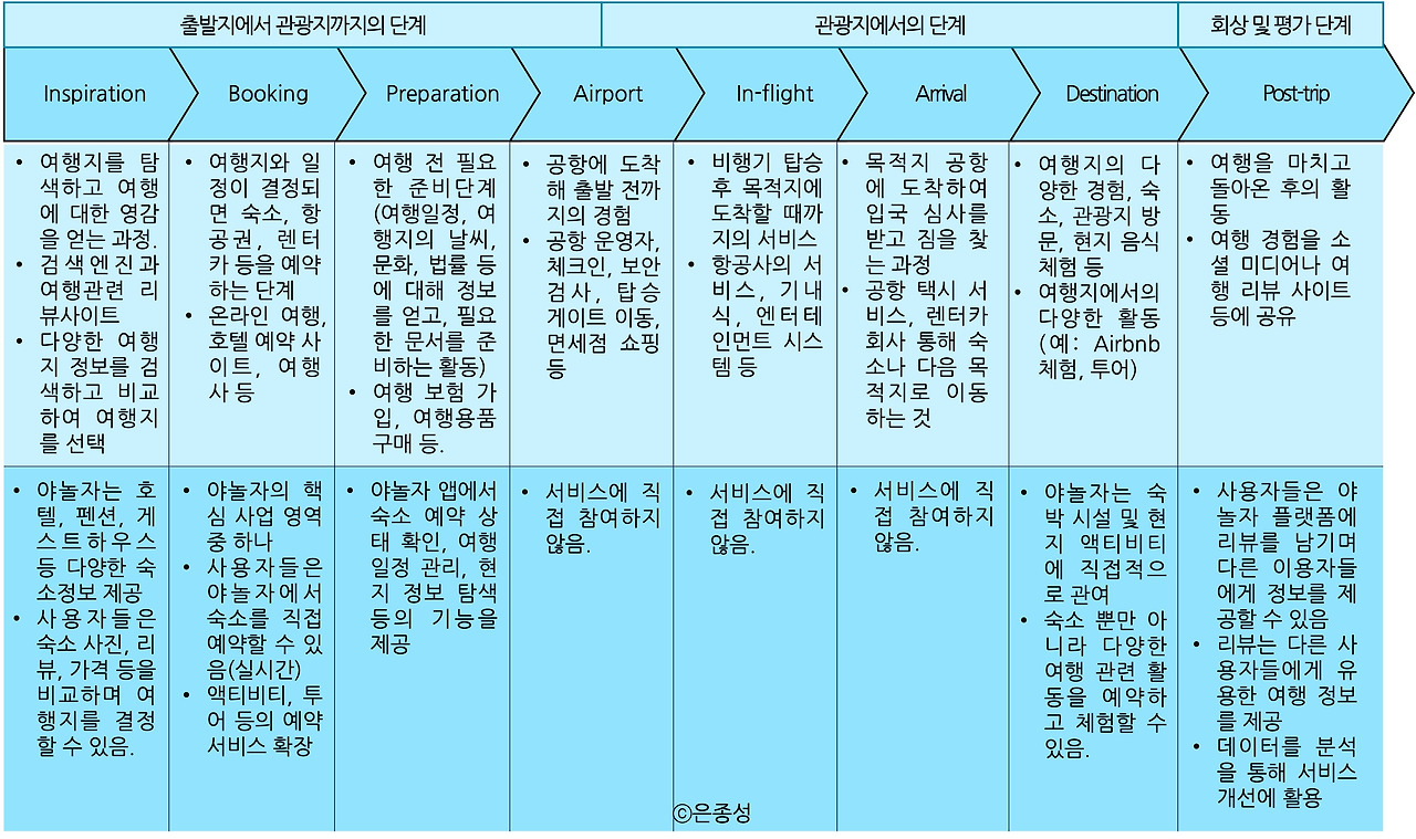 야놀자의 비즈니스모델을 이해하기 위해서는 관광(여행) 산업의 밸류체인(Value Chain)을 들여다볼 필요가 있습니다. 밸류체인은 기업이 고객에게 가치를 전달하는 일련의 활동을 의미하는데요. 야놀자는 현재 여행지를 탐색하고 정보를 얻는 과정에서 호텔, 펜션, 게스트 하우스 등의 정보를 제공하고 있고, 숙소와 항공권, 렌터카, 액티비티 등을 예약할 수 있습니다. 밸류체인 상에서 Inspiration, Booking, Preparation, Destination, Post-trip 단계는 깊숙이 관여되어 있고, Airport, In-flight, Arrival 단계는 간접적인 방식으로만 참여하고 있습니다. 야놀자가 인터파크를 인수한 이유가 상대적으로 부족한 항공과 공연 티켓 부분의 역량을 확보하기 위한 것으로 볼 수 있습니다.