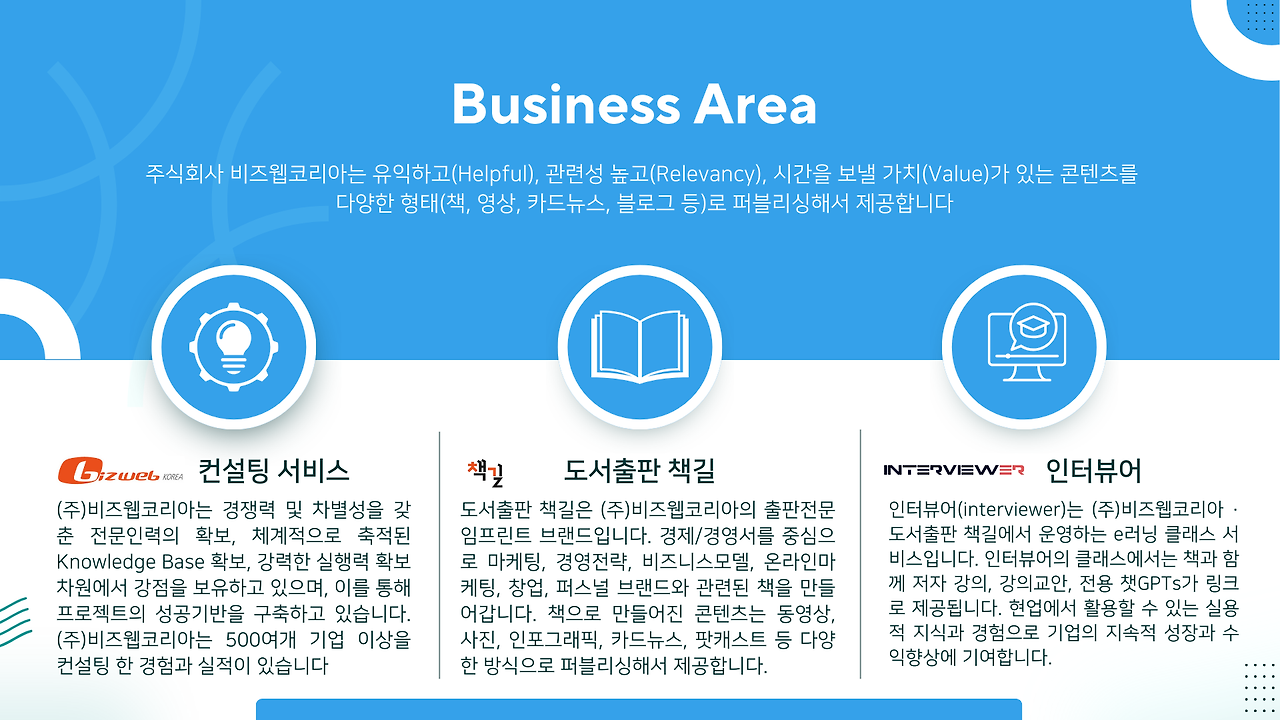 경제경영, 마케팅, 창업 분야는 정확성과 실용성이 특히 강조됩니다. (주)비즈웹코리아 은종성 대표는 3,000회 이상의 기업 강의와 500여 개 기업 컨설팅 경험을 보유하고 있으며, 경영학박사·창업학석사·공학사로 이론과 실무 모두를 겸비했습니다. 이러한 전문성을 바탕으로 일반 독자와 전문가 독자 모두에게 가치 있는 콘텐츠를 만들어냅니다.