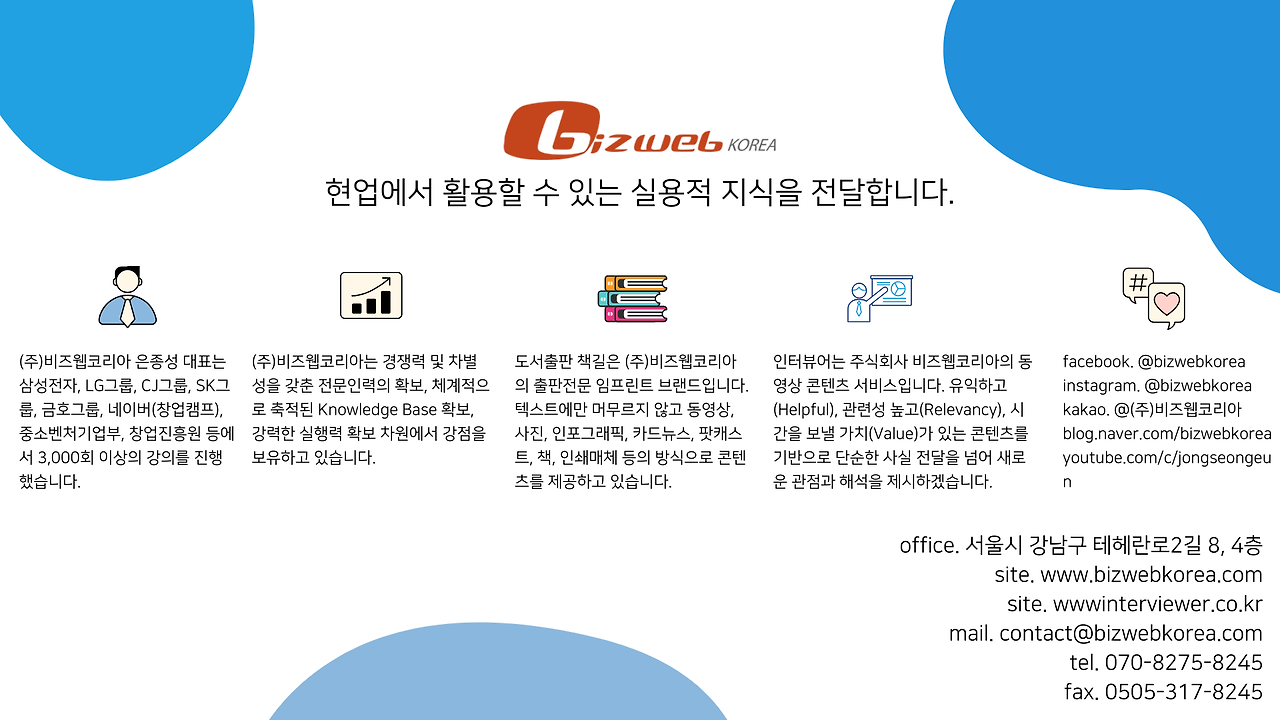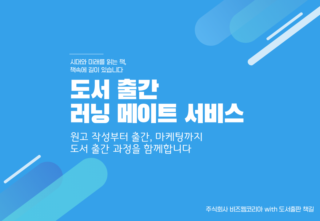 출간 러닝 메이트 서비스에 대한 문의는 이메일(contact@bizwebkorea.com)과 전화(070-8275-8245), 홈페이지 방문 후 카카오톡 채널 등을 통해 언제든 편하게 연락해 주십시오. (주)비즈웹코리아는 저자분께서 책 한 권을 온전히 완성해 내는 모든 과정을 함께하면서 성공적인 출판을 돕겠습니다.