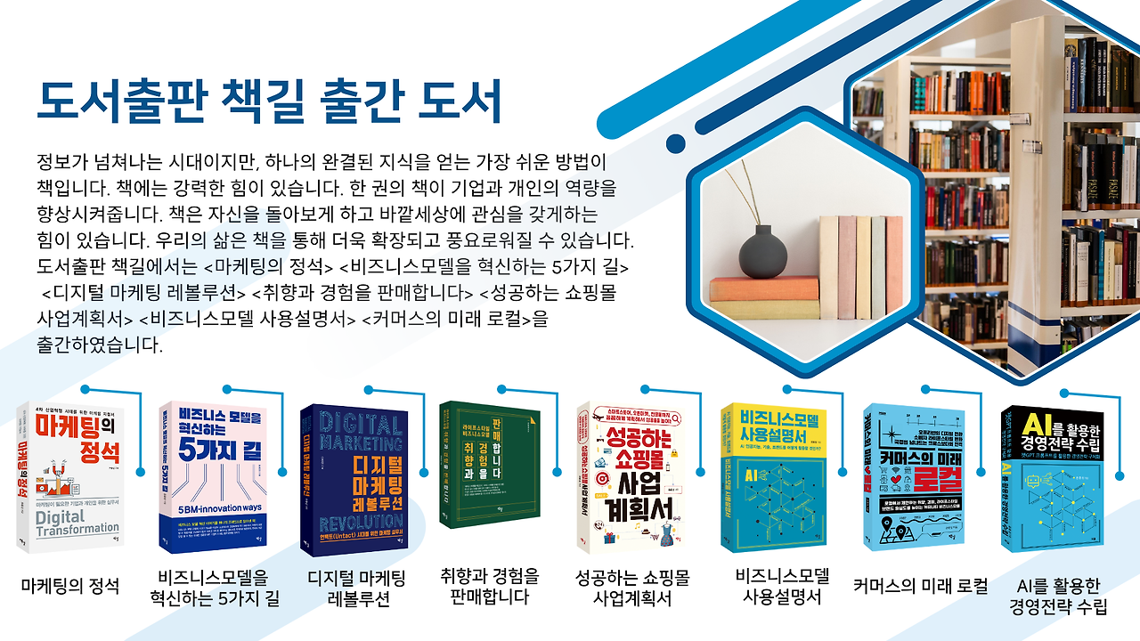 기업 강사와 컨설턴트로 활동하던 중 2018년도에 ‘도서출판 책길’을 시작했습니다. 출판을 결심한 이유는 실무 경험을 강의/컨설팅과 연계해서 해보고 싶었기 때문입니다. 웹 에이전시와 인터넷 쇼핑몰 운영을 거쳐 강의와 컨설팅 시장에 들어섰지만, 어느 순간 실무에서 점점 멀어지고 있다는 느낌이 들었습니다. 다시 쇼핑몰을 운영하기엔 강사와 컨설턴트로서의 삶도 충분히 매력적이었고, 무엇보다 실무에서 얻은 경험을 기록으로 남기고 싶다는 생각이 컸습니다.