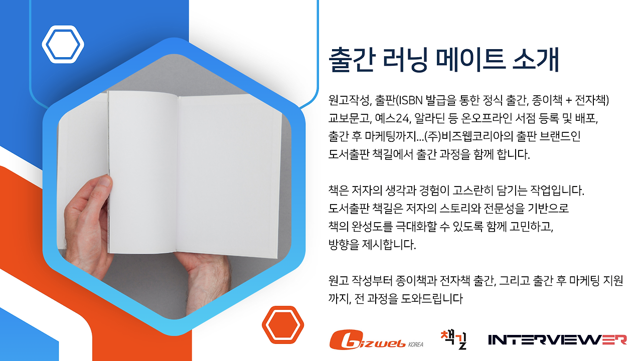 일부 책 쓰기 프로그램에서는 1천만 원~2천만 원 사이의 비용을 받고도 원고 작성부터 종이책 출간까지 끝까지 책임지지 않는 경우도 적지 않습니다. 하지만 (주)비즈웹코리아의 ‘출판 러닝 메이트’ 서비스는 원고 작성, 내지 디자인, 표지 디자인, 종이책(전자책 동시 출간), 그리고 교보문고·예스24·알라딘 등 온·오프라인 서점 유통까지 패키지로 지원해 드립니다. 출간된 책은 (주)비즈웹코리아와 정식 계약을 체결하고, 판매량에 따라 저자에게 인세를 지급해 드립니다.