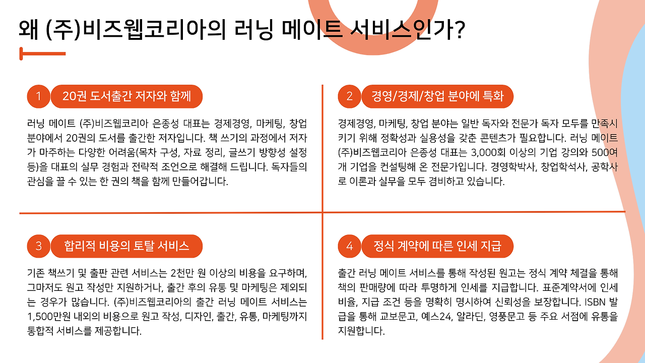 기존 책 쓰기·출판 관련 서비스의 경우, 2천만 원 이상의 비용을 요구하거나, 원고 작성만 지원하고 출간 후 유통·마케팅은 제외되기도 합니다. 반면, (주)비즈웹코리아의 ‘출간 러닝 메이트’ 서비스는 1,500만 원 내외의 비용으로 원고 작성부터 디자인, 출간, 유통, 마케팅에 이르는 전 과정을 패키지로 제공합니다. 저자는 한 번에 모든 과정을 해결할 수 있어 효율적입니다.