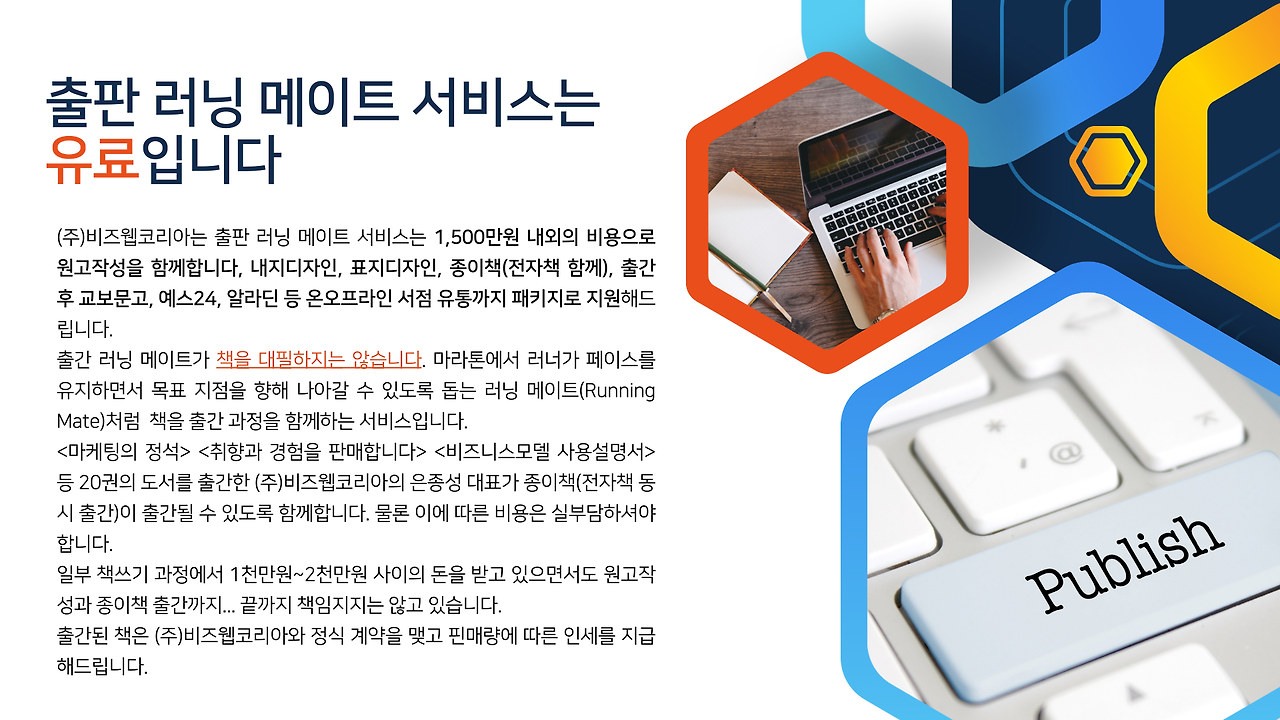 ‘출간 러닝 메이트’ 서비스는 책을 대필하는 것이 아니라, 마라톤에서 저자 옆을 함께 달리며 양질의 결과물을 만들 수 있도록 돕는 개념입니다. (주)비즈웹코리아 은종성 대표가 종이책과 전자책이 원활하게 출간될 수 있도록 함께합니다. 물론 '출간 러닝 메이트'서비스는 '유료'입니다.