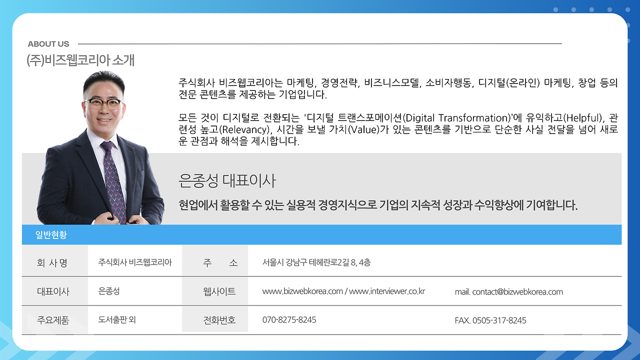 출간은 도서출판 책길에서 책임집니다. 도서출판 책길은 (주)비즈웹코리아의 출판 전문 임프린트 브랜드로, 경제경영서를 비롯해 마케팅, 경영전략, 비즈니스 모델, 온라인마케팅, 창업, 퍼스널 브랜드와 관련된 책을 전문적으로 만들어 갑니다. 완성된 책의 콘텐츠는 블로그, 동영상, 인포그래픽, 카드뉴스 등 다양한 형식으로 확장하여 제공합니다.
