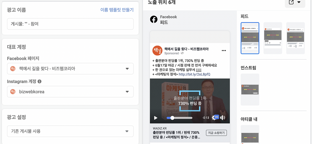 <마케팅의 정석> 크라우드 펀딩은 책으로만 펀딩률을 높였던 것이 아니었습니다. 페이스북, 인스타그램, 유튜브, 블로그 등에 콘텐츠를 업로드하는 한편 네이버, 유튜브, 페이스북, 인스타그램 등에 적극적으로 광고를 집행하기도 했습니다. 페이스북(인스타그램)의 경우 콘텐츠별 방문자를 맞춤타겟으로 설정하여 유사타겟으로 확장하는 방식으로 500%, 600%, 700%.... 1000%까지 타깃 고객과 콘텐츠, 메시지를 최적화하는 형태로 광고를 집행했습니다. 물론 이 과정에서 적지 않은 광고비가 집행되었습니다. 아래 화면은 730% 펀딩 단계에서 동영상 콘텐츠로 참여형 광고를 집행했던 화면입니다.
