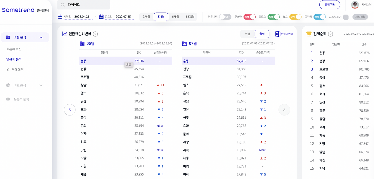 이처럼 사람들이 SNS에서 남긴 흔적을 분석해 주는 서비스가 썸트렌드입니다. 관심 있는 키워드를 검색하면 일별, 주별, 월별 언급량이 그래프로 나타나고, 해당 키워드의 연관어 변화 추세도 볼 수 있습니다. 예를 들면, ‘감성어 변화’ 카테고리에서는 검색한 사람들이 드러낸 감정적인 키워드를 보여주는데, ‘다이어트’를 검색하면 긍정 69.5%, 부정 27.3%, 중립 3.2%라는 통계수치가 나옵니다. 또 다이어트는 스트레스일 것 같지만 ‘스트레스’, ‘고민’, ‘힘들다’, ‘실패하다’ 같은 부정적 키워드보다는 ‘좋다’, ‘건강하다’, ‘성공하다’, ‘도움 되다’, ‘칼로리 낮다’ 같은 긍정 키워드가 많음을 알 수 있습니다. 이런 감정적 키워드를 순위별로 모아 제공하므로 소비자들 이 무엇을 원하는지 파악하는 데 도움이 됩니다.