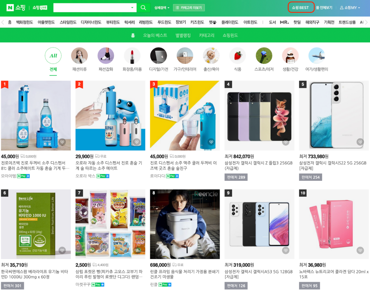 네이버 쇼핑에서는 ‘쇼핑 BEST’라는 카테고리에서 현재 많이 판매되는 상품을 보여줍니다. 카테고리별로 많이 본 상품, 많이 구매한 상품, 인기 브랜드, 트렌드 키워드로 세분화해서 정보를 제공하므로 아이템 선정 시 범위를 축소하는데 효과적입니다. 물론, 제시되는 정보를 어떻게 해석할지는 창업자의 몫입니다. 카테고리별로 잘 팔리는 상품의 공통점이 무엇인지, 사람들이 왜 이런 키워드로 검색하는지, 어떤 소비자들이 주로 구매하는지 등을 분석해야 합니다.