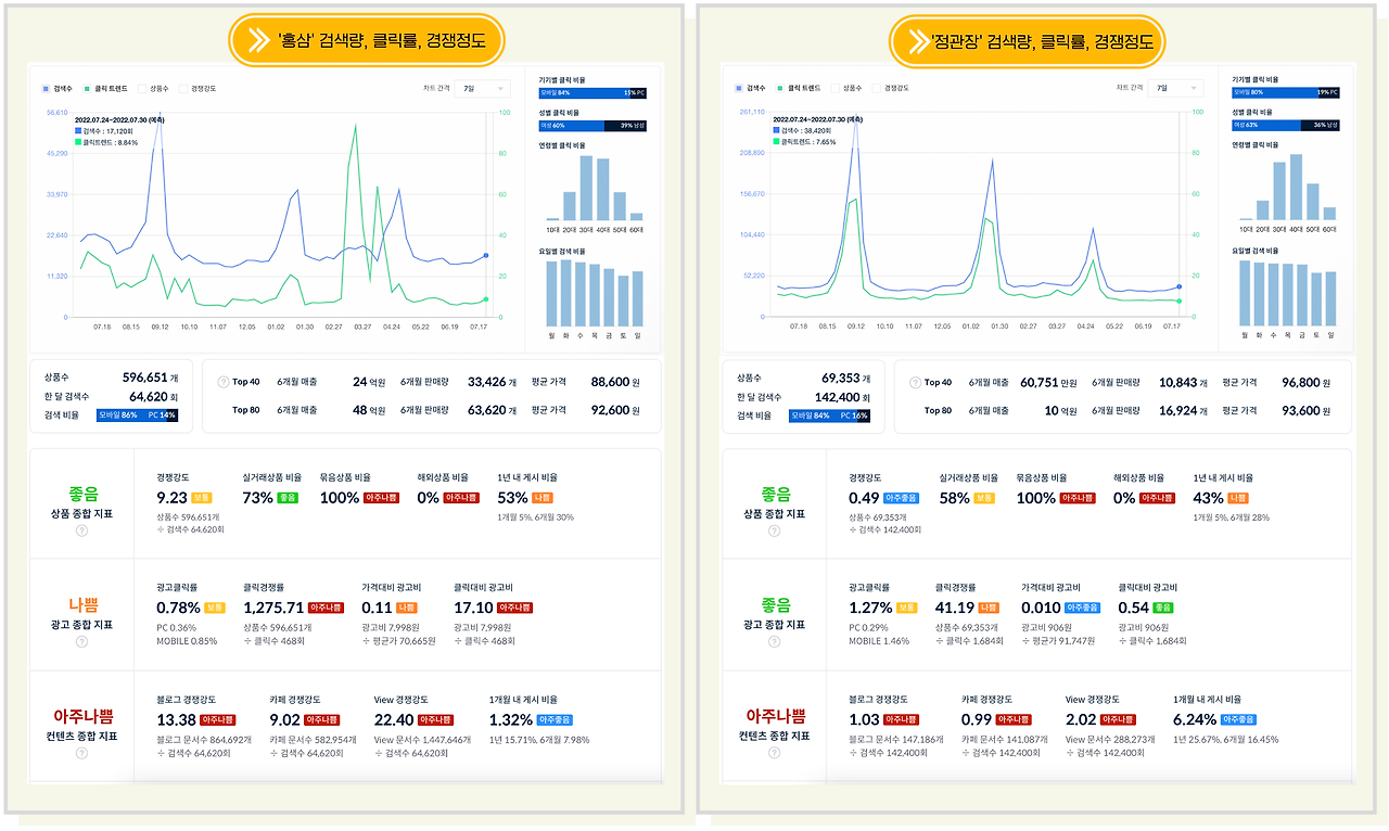아이템스카우트는 네이버 쇼핑, 쿠팡, 옥션, 지마켓, 11번가 등에서 판매되는 상품군별 검색량과 판매량, 경쟁하는 상품의 수, 광고 수, 최신 트렌드 등의 데이터를 가공해서 알려줍니다. 예를 들어, 아이템스카우트 ‘키워드 분석’ 카테고리에서 ‘홍삼’과 ‘정관장’을 검색해 보면 ‘정관장’ 검색량이 ‘홍삼’보다 몇 배 많음을 알 수 있습니다. 반면, 경쟁강도는 검색량이 많은 ‘정관장’이 낮게 나타납니다. 홍삼을 판매하는 사람들은 ‘홍삼’이 대표 키워드라고 생각할지 모르나 홍삼의 대표 키워드는 ‘정관장’입니다. 이처럼 카테고리보다 브랜드가 강한 상품군이라면 브랜드 상품을 판매해야 승산이 있습니다.