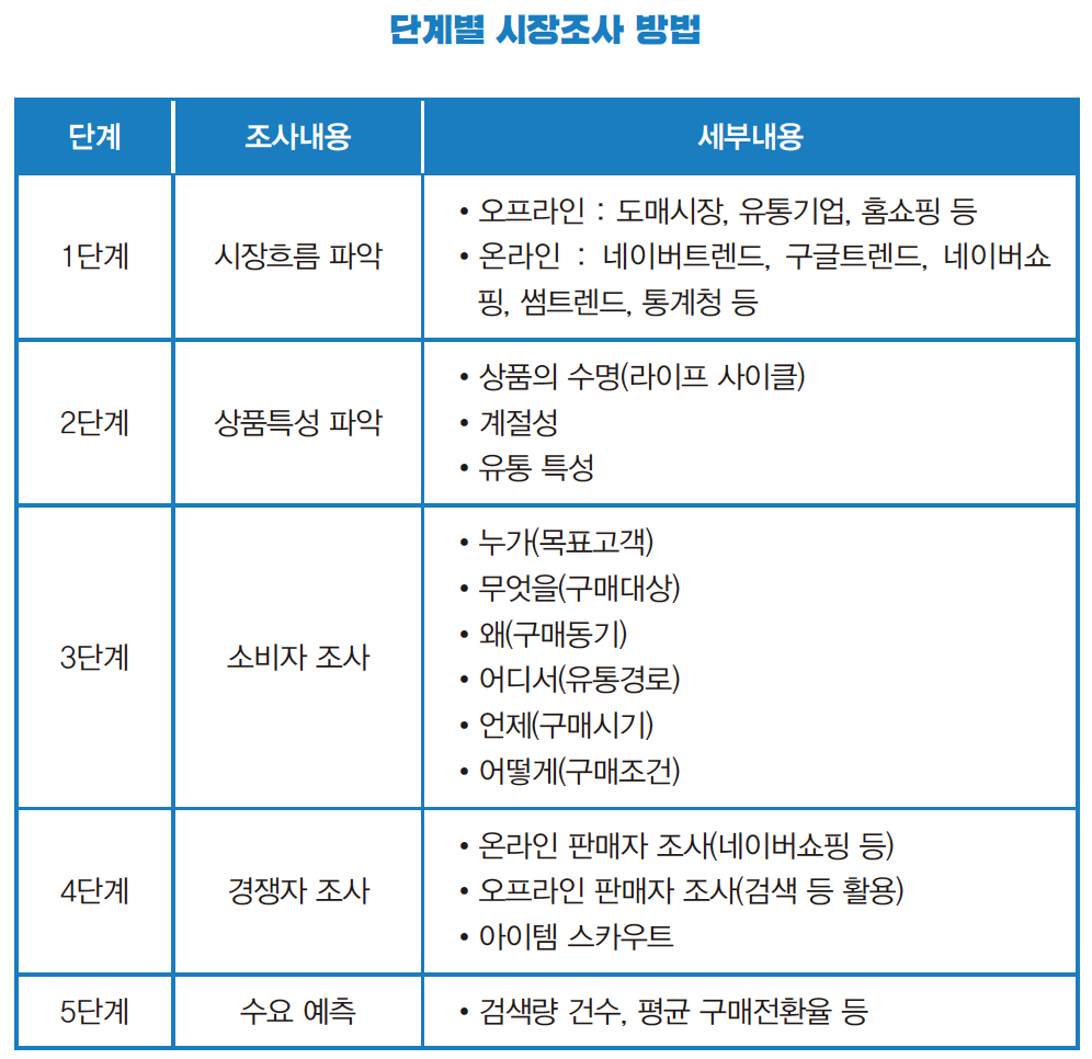 시장 흐름 파악을 위해서는 도매시장(동대문, 남대문 등), 대형 할인마트, 백화점 같은 오프라인과 함께 홈쇼핑에서 판매되는 제품들도 점검해 보는 게 좋습니다. 이를 바탕으로 네이버, 아이템스카우트(www.itemscout.io), 썸트렌드(www.some.co.kr), 통계청 자료 등을 활용하면 대략적인 시장 흐름 파악이 가능합니다.
