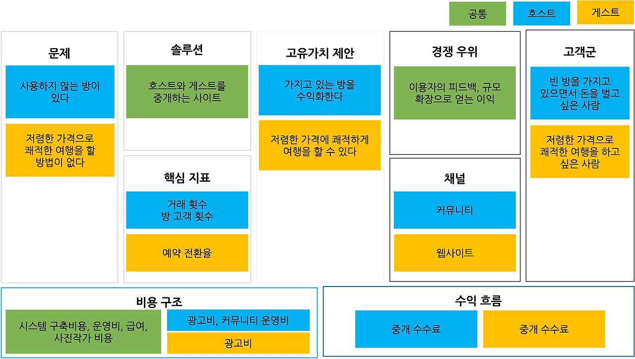 위에서 제시한 '빈 방을 갖고 있는 사람과 빈 방을 필요로 하는 사람들을 연결해 주는 플랫폼'에 대한 린 캔버스를 작성하면 아래와 같습니다. 초기 에어이앤비의 린캔버스라고 할 수 있습니다.