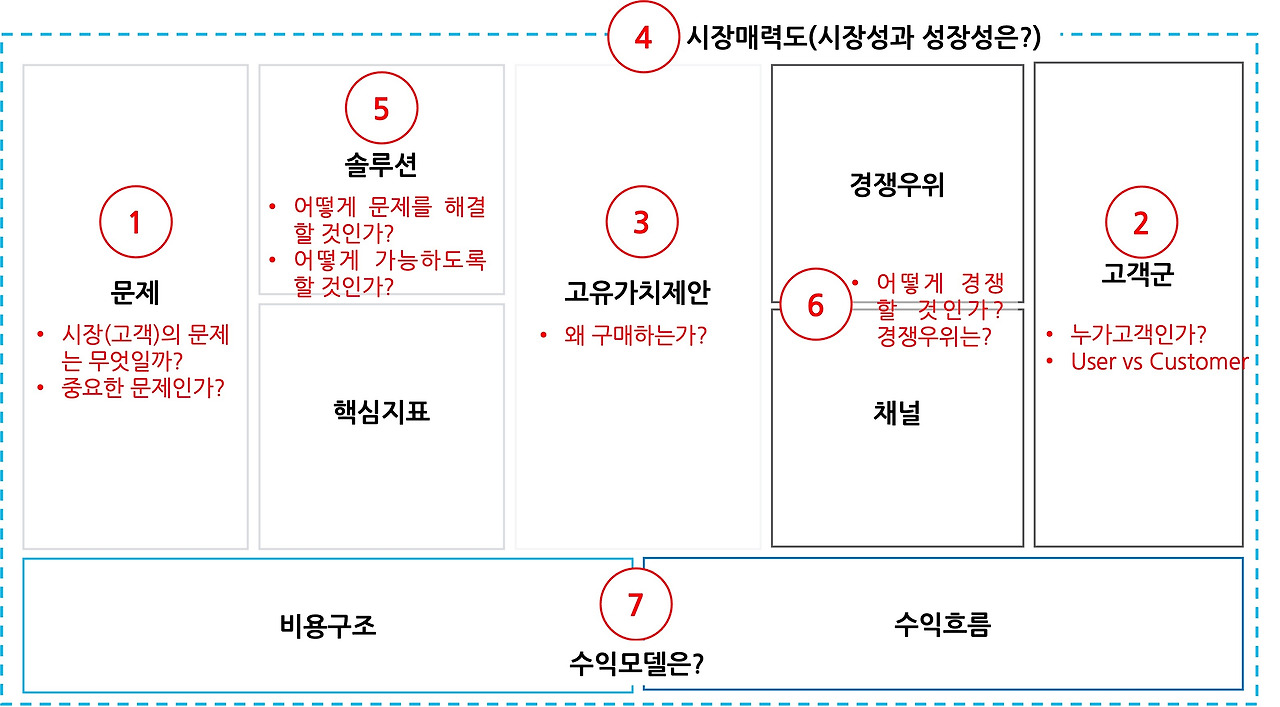 앞선 포스팅에서 아이디어를 비즈니스모델로 구조화하기 위한 7가지 질문을 포스팅했습니다. 7가지의 질문인 1) 시장(고객)의 문제, 2) 고객군, 3) 구매 이유, 4) 시장 매력도, 5) 우리의 해결방안(솔루션), 6) 경쟁우위, 7) 수익모델을 린 캔버스에 대입시켜 보면 아래와 같이 매칭될 수 있습니다