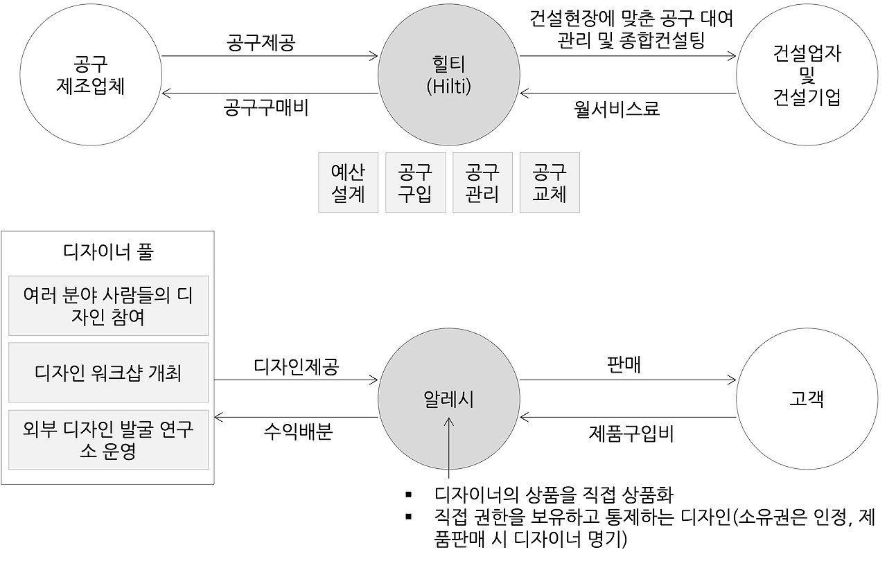 가치전달 방식은 아이디어 도출 초기에 생각을 구조화할 때 사용됩니다. 칠판이나 노트 등에서 비즈니스의 주체를 그려놓고 서로 무엇을 주고받는지를 중심으로 접근해 보는 것입니다. 물론 가치전달 중심으로 구성되다 보니 비즈니스에 필요한 여러 요소를 표현하기에는 한계가 있습니다.