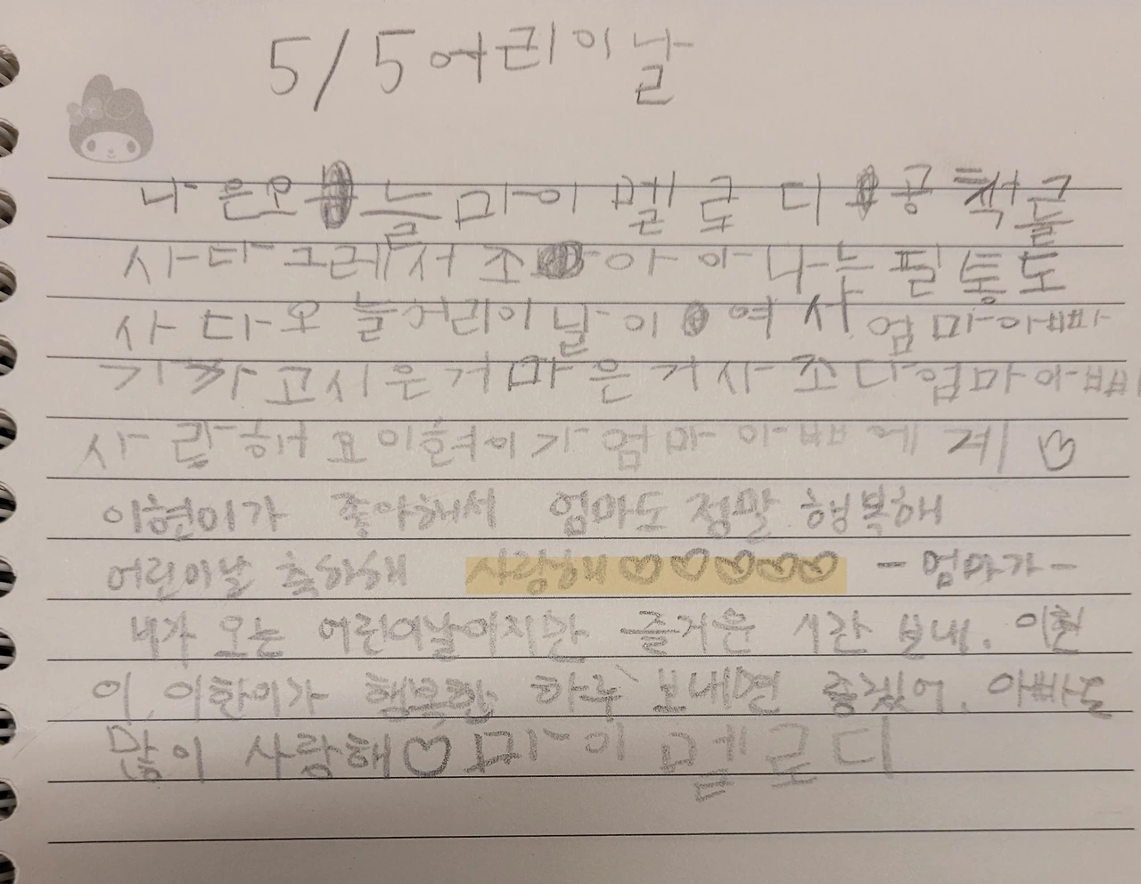 그리고 이번 어린이날을 맞아 아이 선물을 고르러 갔다가 때마침 아이가 마이멜로디 노트를 갖고 싶어 해서 저희 집도 우연찮게 아이와 교환일기를 시작하게 되었습니다.