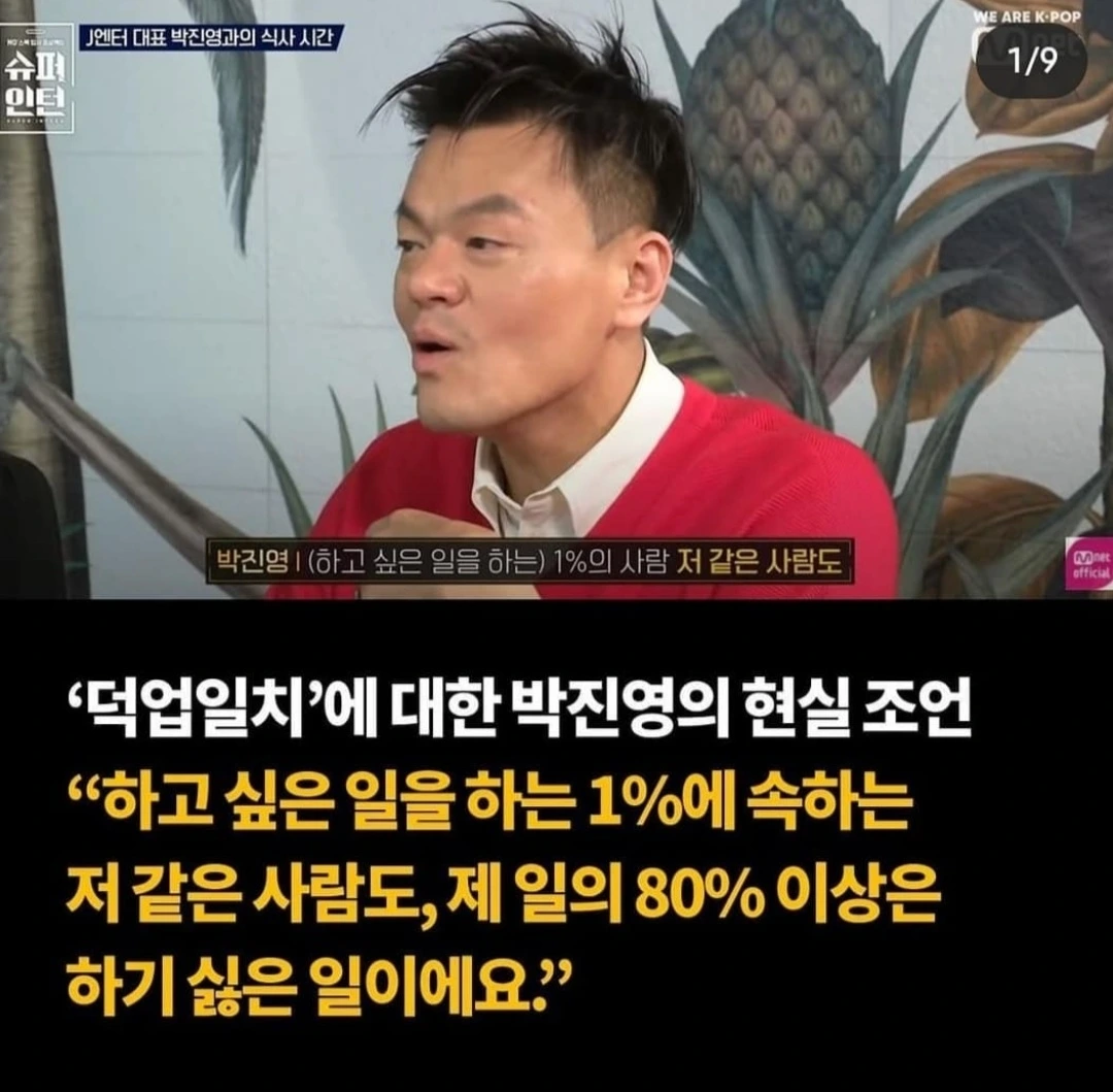 하고 싶은 일을 하는 1%에 속하는 저 같은 사람도 제 일의 80% 이상은 하기 싫은 일이에요.덕업 일치에 대한 박진영의 현실 조언