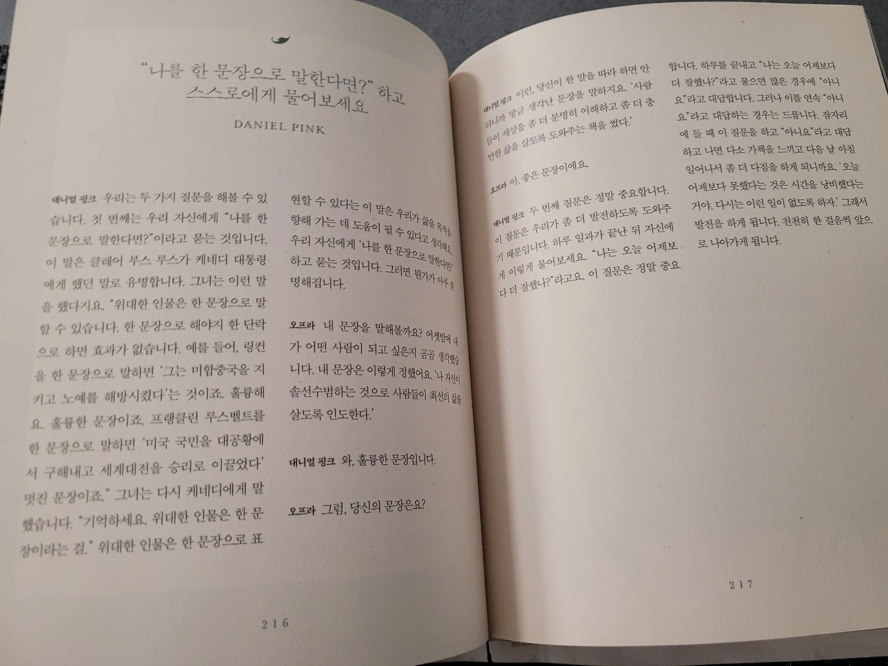 이 책의 둘의 대화에서 '위대한 인물들은 모두 한 문장'이라고 합니다.