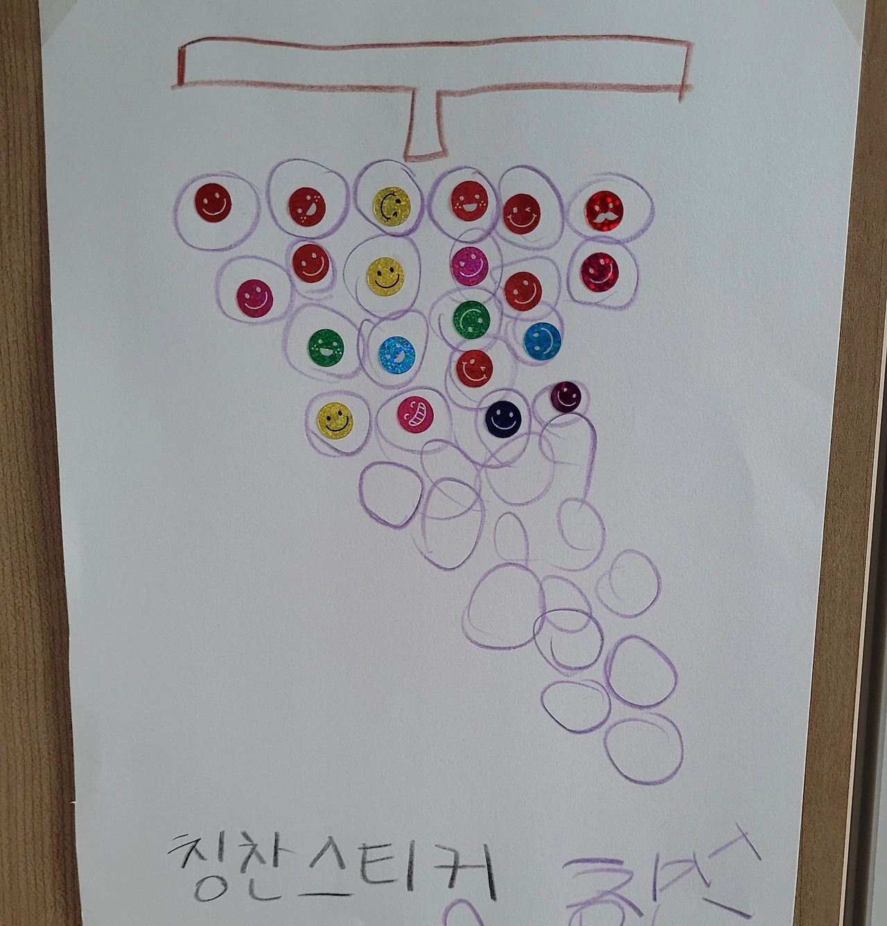 아이의 분리불안과 우울증을 연상시킬 만큼 심한 울음으로 많은 고민을 하게 되었고, 그날 바로 아이와 함께 칭찬스티커를 위한 포도송이를 그렸습니다. 그리고 사소하고 작은 일 하나부터 칭찬하고 스티커를 붙여주었습니다.