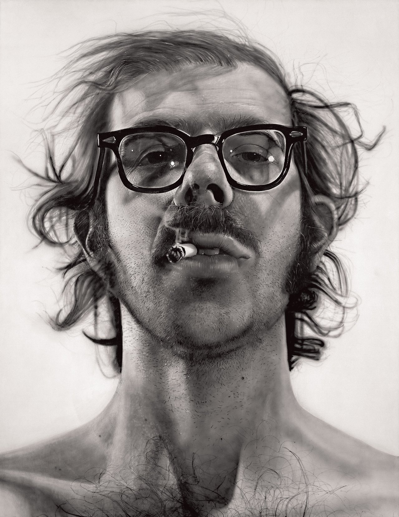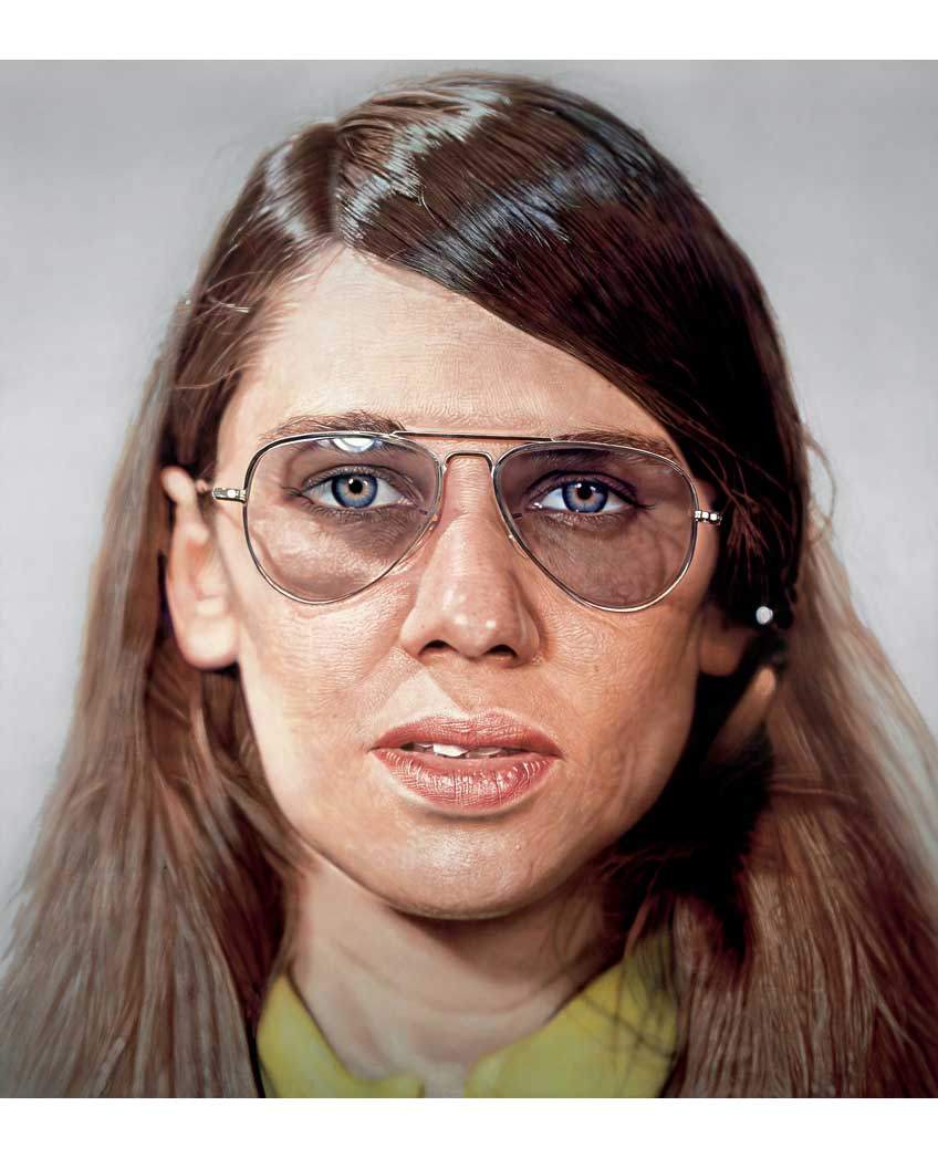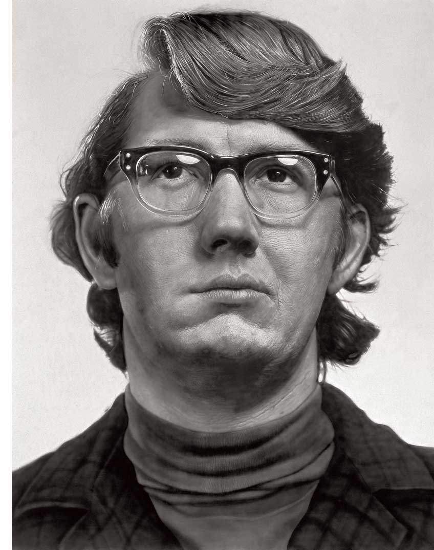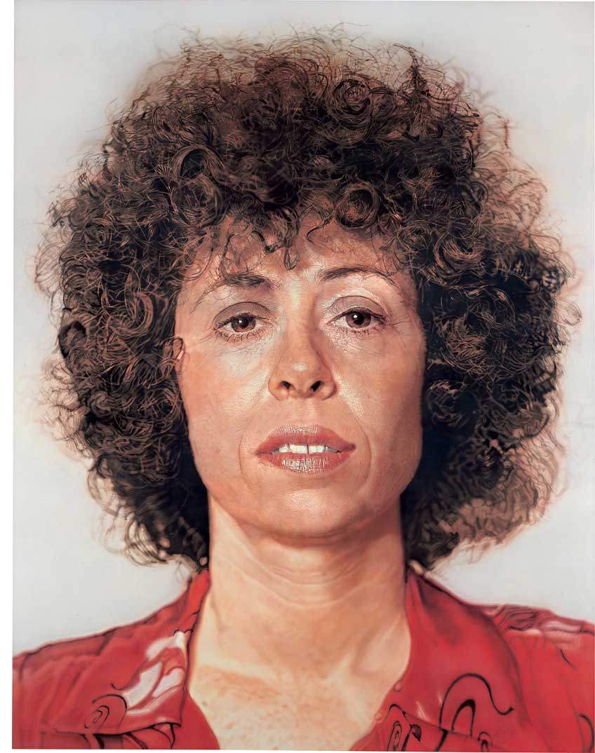그는 마치 평범한 포즈의 얼굴을 근접 촬영해 그것을 다시 그림으로 그린다. 그 얼굴은 전혀 꾸며지지 않은 채, 민망할 정도로 사실적이다. 마치 경찰이 범죄자의 얼굴을 인식하기 위해서 찍은 머그샷(mug shot)과 같다. 아래의 그림처럼, 얼굴에 있는 주름부터 늘어진 땀구멍까지 모두 그려 넣는다. 이렇게 그는 아름답지도 극적이지도 않은 무미건조한 얼굴 사진을 똑같이 확대해 거대한 캔버스에 옮겼다.
